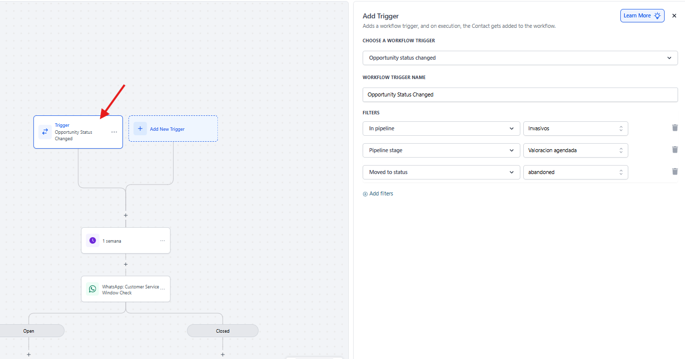 Normalmente, se utiliza como disparador “Opportunity Status Changed”, ya que permite detectar cambios específicos en el estado de una oportunidad dentro del pipeline. Esto es fundamental en procesos de reactivación, ya que se busca actuar automáticamente cuando una oportunidad cambia a un estado que indica inactividad, abandono o necesidad de seguimiento especial.