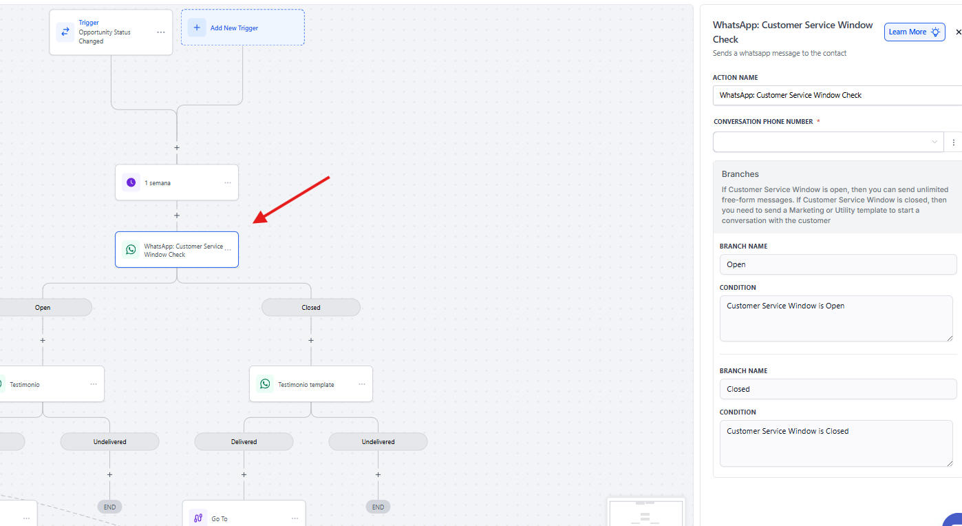 Esta acción permite enviar un mensaje de WhatsApp al contacto, pero con una lógica condicional avanzada que verifica si la Ventana de Servicio al Cliente del cliente está Abierta o Cerrada. Esta distinción es crucial para cumplir con regulaciones de marketing y para respetar la preferencia del cliente en cuanto a la comunicación.