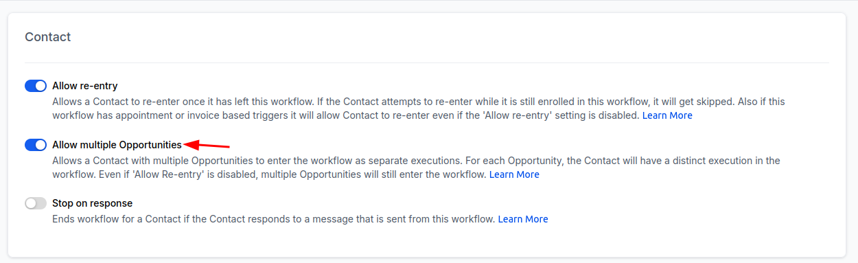 En esta sección se configuran las opciones relacionadas con el comportamiento de los contactos dentro de un flujo de trabajo. Estas configuraciones permiten definir cómo y cuándo un contacto puede ingresar al flujo, si puede hacerlo más de una vez, cómo se gestionan múltiples oportunidades asociadas y en qué casos el flujo debe finalizar automáticamente.
