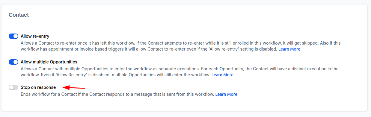 Si el flujo de trabajo utiliza disparadores basados en citas (appointments) o facturas (invoices), el Contacto podrá reingresar al flujo incluso cuando esta opción esté deshabilitada, ya que estos eventos generan ejecuciones independientes.