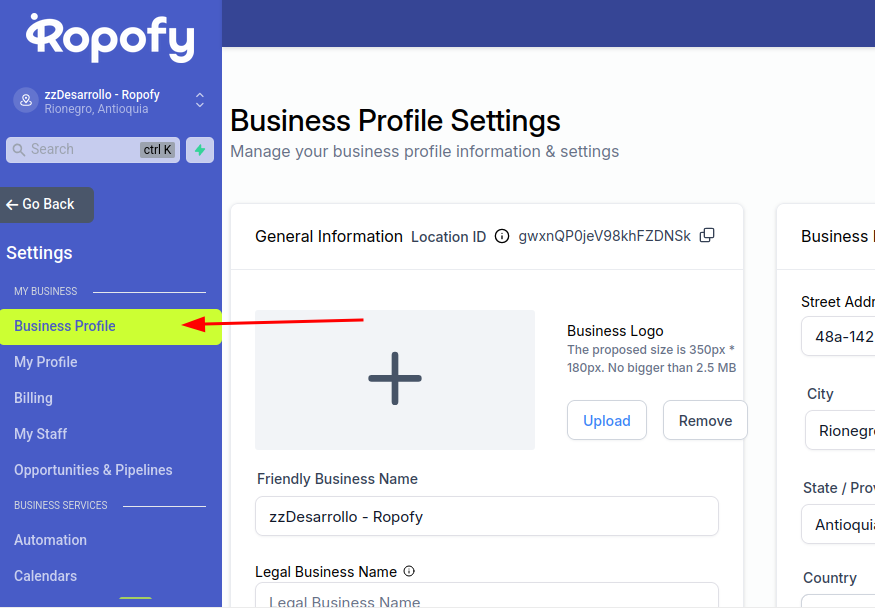 Por defecto e sistema nos ubica en "Buiness Profile" o "Perfil de la empresa"