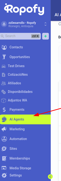 En el panel principal izquierdo se encuentra el el apartado de "Agentes de IA" o "AI agents"