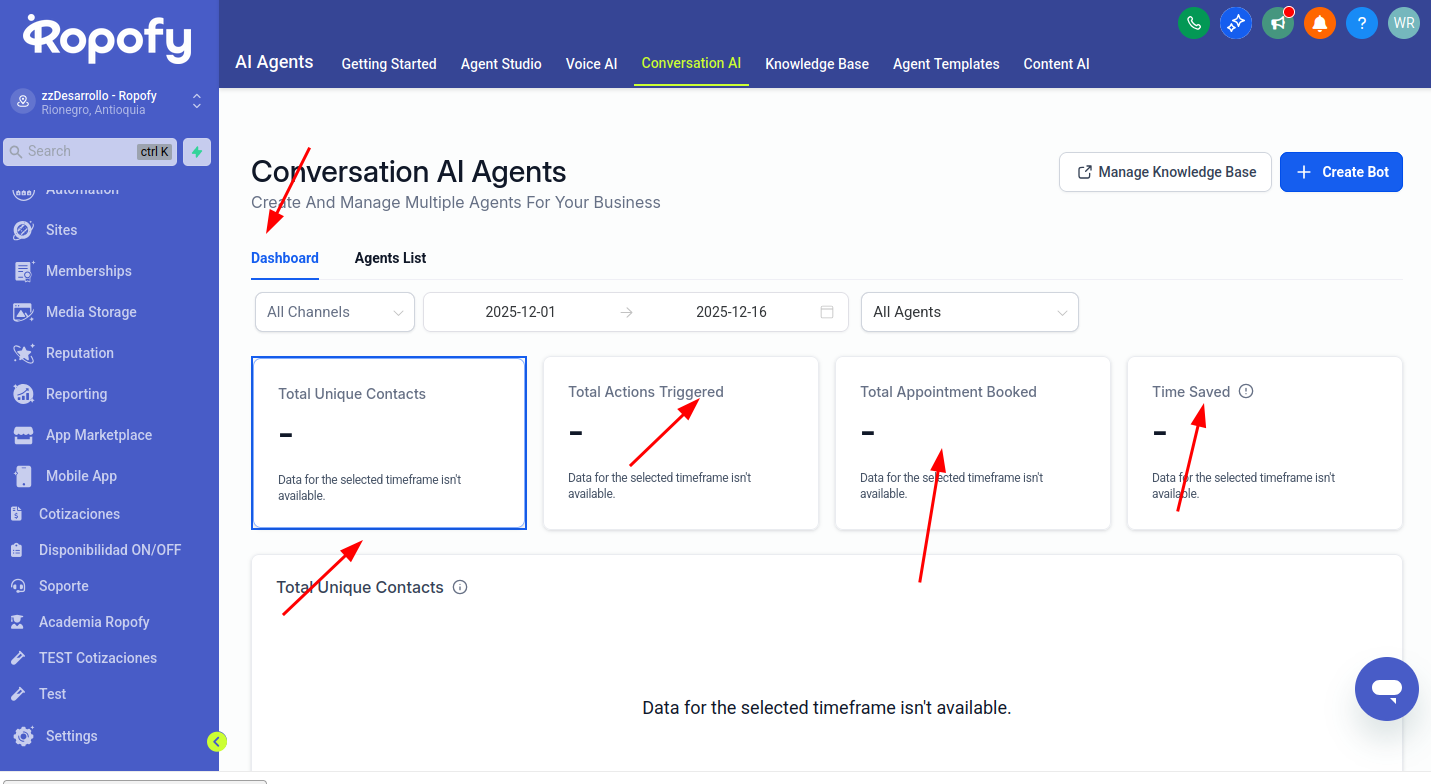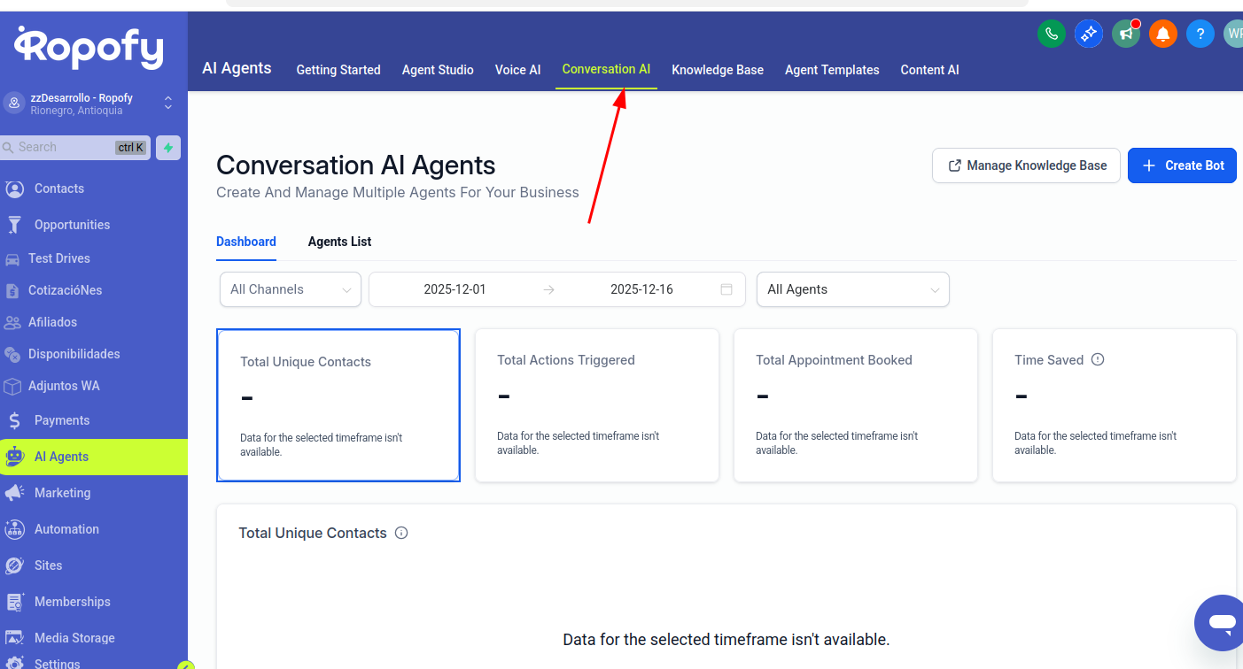 En el apartado nos centraremos en conversation AI , en esta seccion se permite ver las metricas de los bots y el inicio de la creacion de los bots