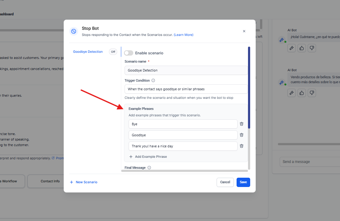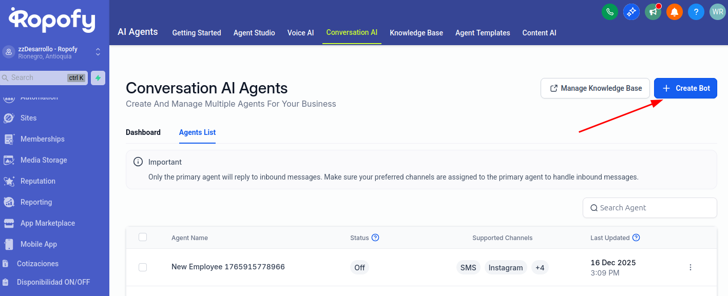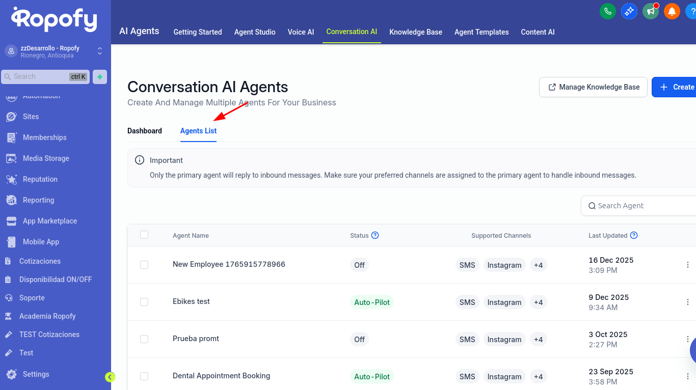 La sección "Agents List" se encuentra dentro del módulo "Conversation AI Agents" y tiene como objetivo principal gestionar y supervisar todos los bots (agentes de IA) configurados para el negocio. Aquí se puede ver el estado, los canales asignados y realizar acciones de administración sobre cada agente.