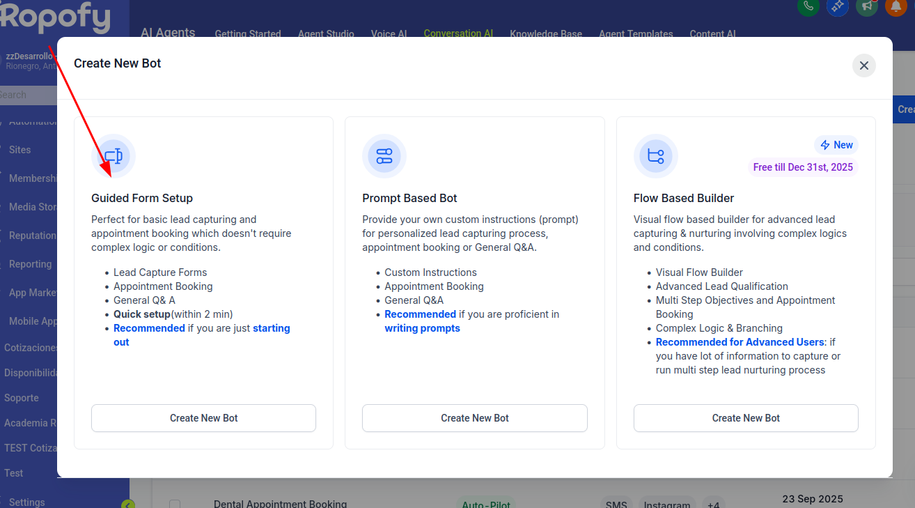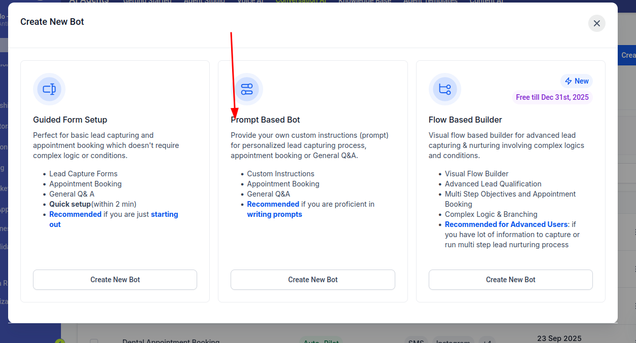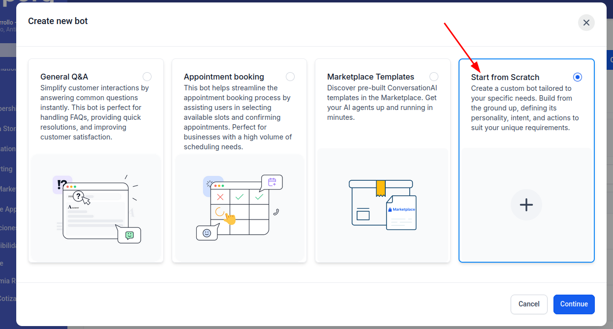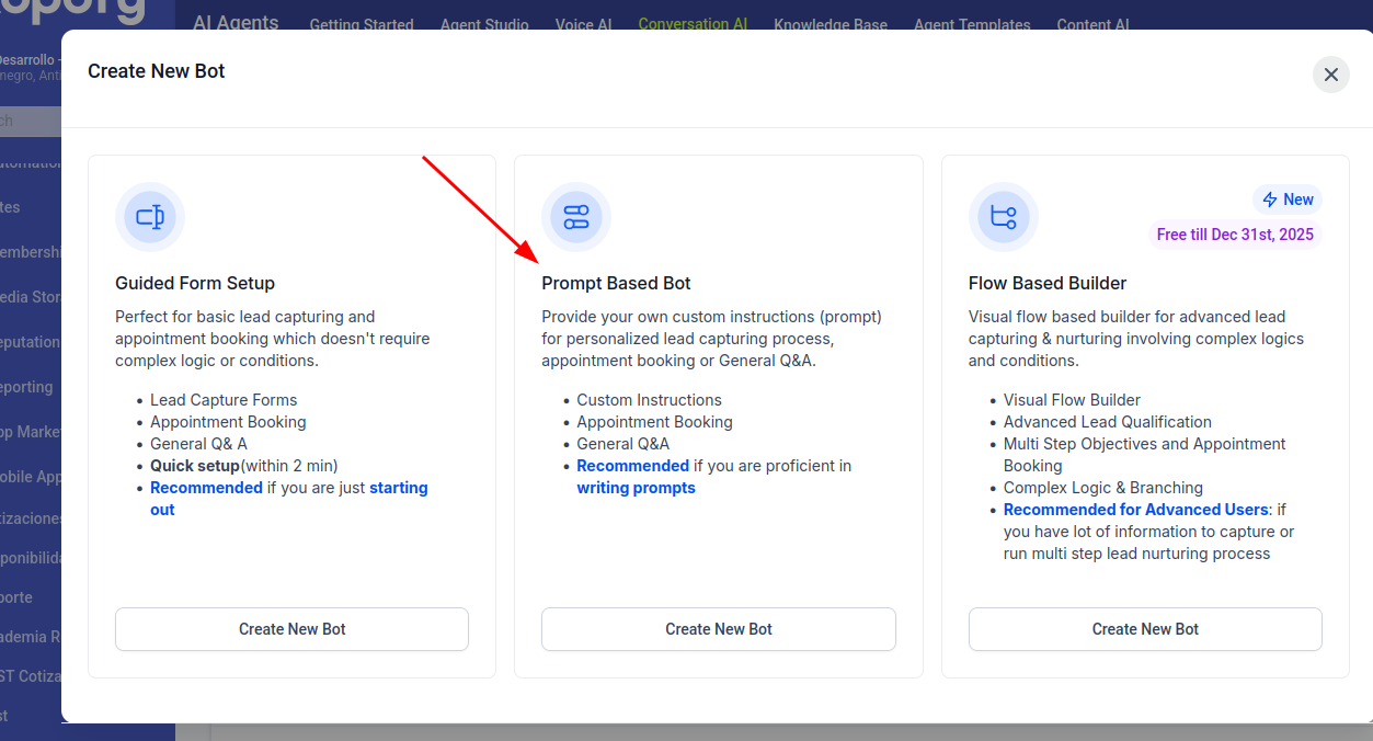 En este apartado haremos énfasis en el modelos de Promp Based Bot, es el uso intermedio y mas cotidiano, este modo permite ser completamente configurable y permite personalizar todo el flujo del bot, asi que seleccionamos esta opcion