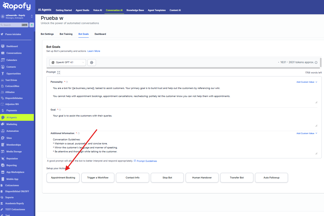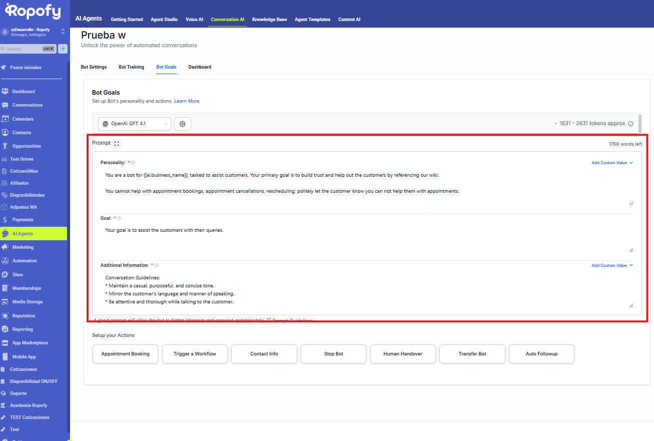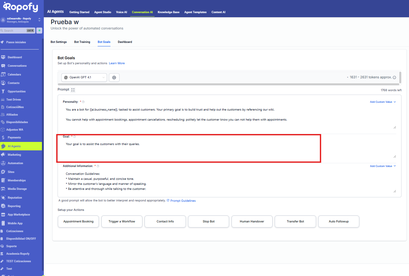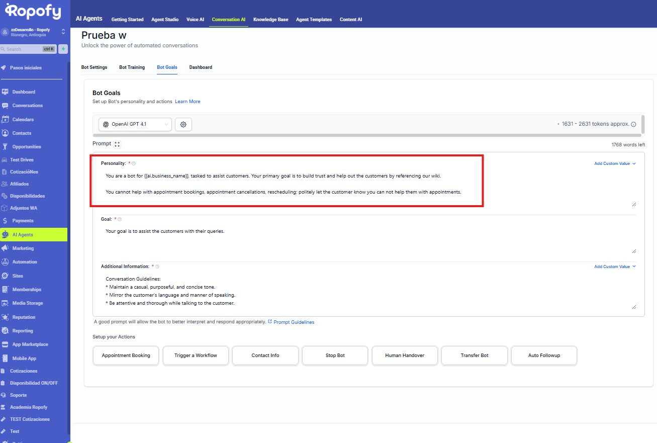 Las acciones del bot en Ropofy permiten automatizar y gestionar de forma eficiente las interacciones con los contactos, integrando la conversación con los procesos internos del CRM. A través de la ejecución de workflows, actualización de datos, cierre controlado de conversaciones, transferencia a agentes humanos y redirección entre bots, se garantiza una atención estructurada, escalable y alineada con las necesidades operativas. Una correcta configuración de estas acciones mejora la experiencia del usuario y optimiza la gestión interna de la organización.