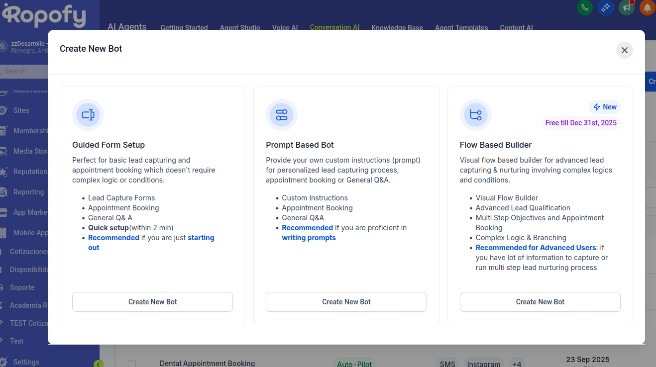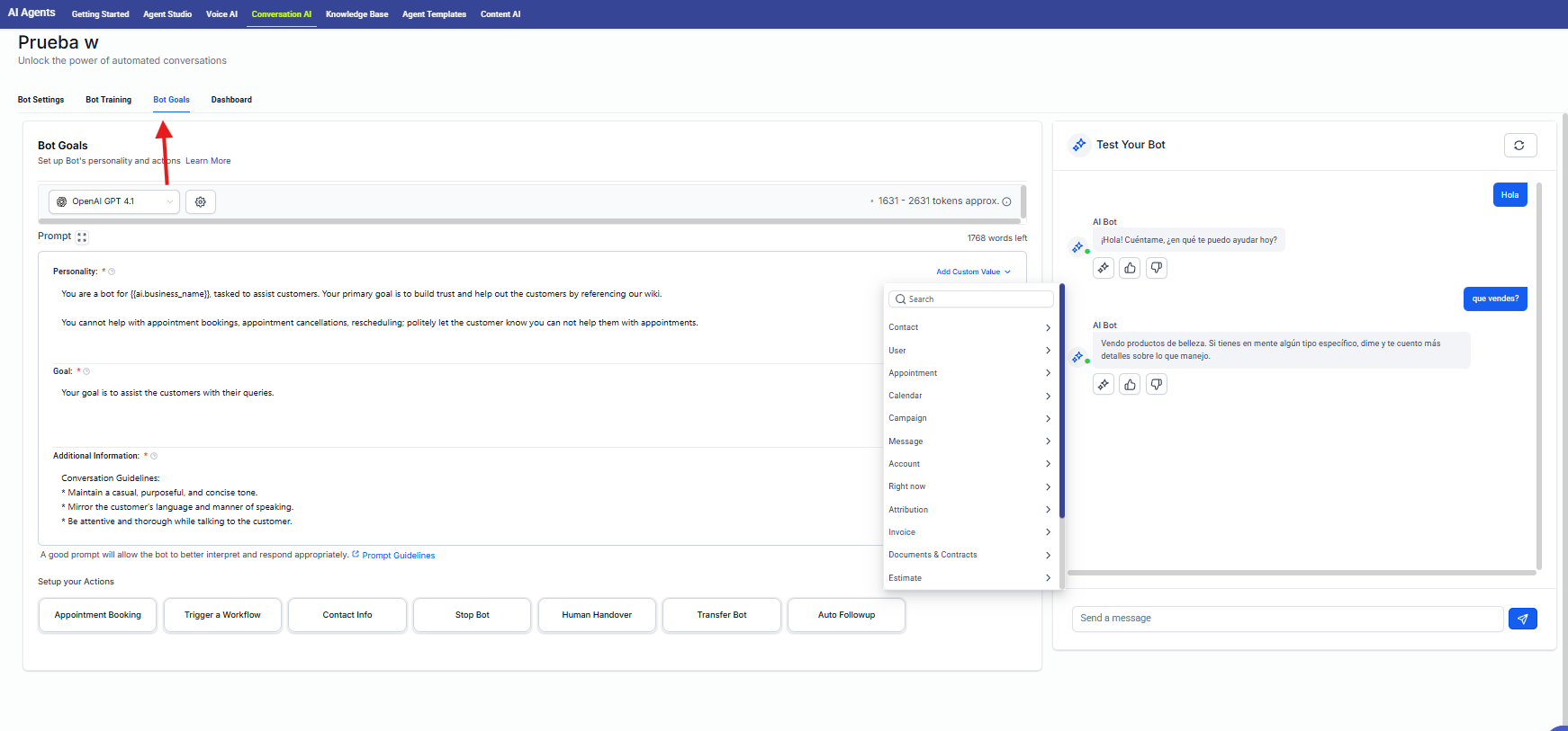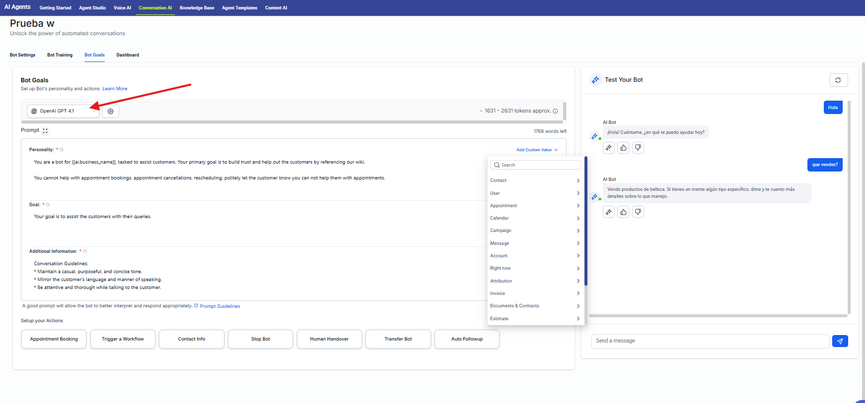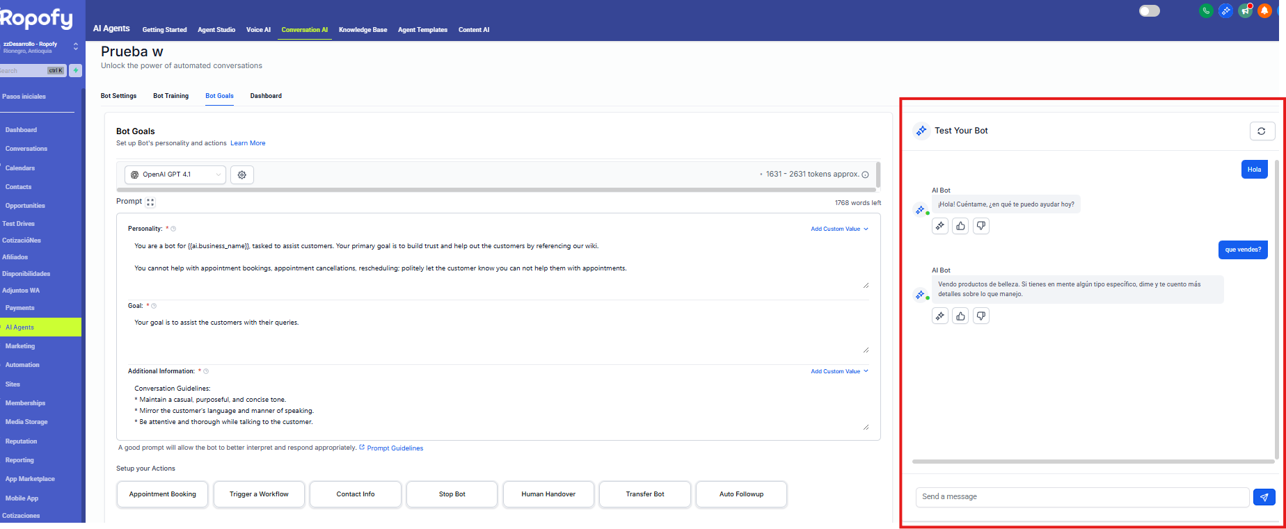 Las acciones del bot en Ropofy permiten automatizar y gestionar de forma eficiente las interacciones con los contactos, integrando la conversación con los procesos internos del CRM. A través de la ejecución de workflows, actualización de datos, cierre controlado de conversaciones, transferencia a agentes humanos y redirección entre bots, se garantiza una atención estructurada, escalable y alineada con las necesidades operativas. Una correcta configuración de estas acciones mejora la experiencia del usuario y optimiza la gestión interna de la organización.