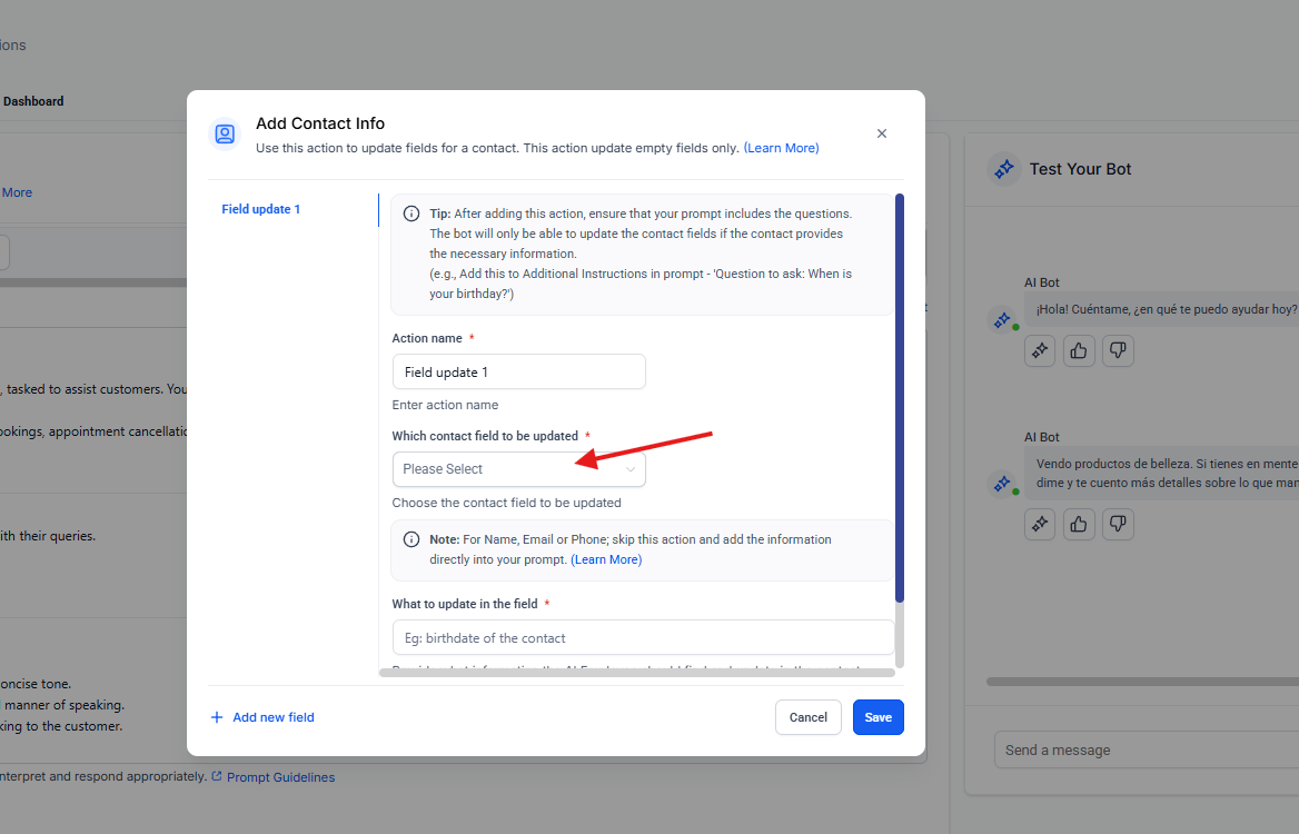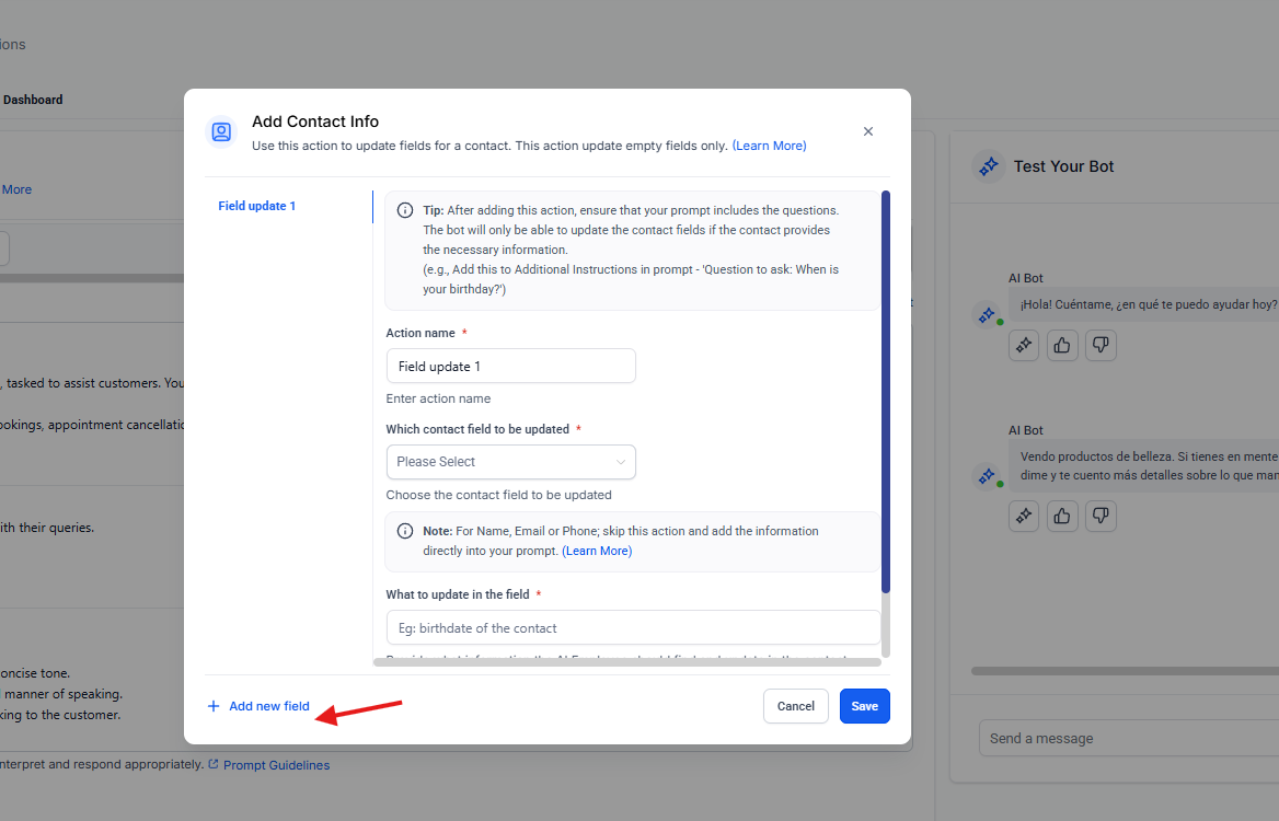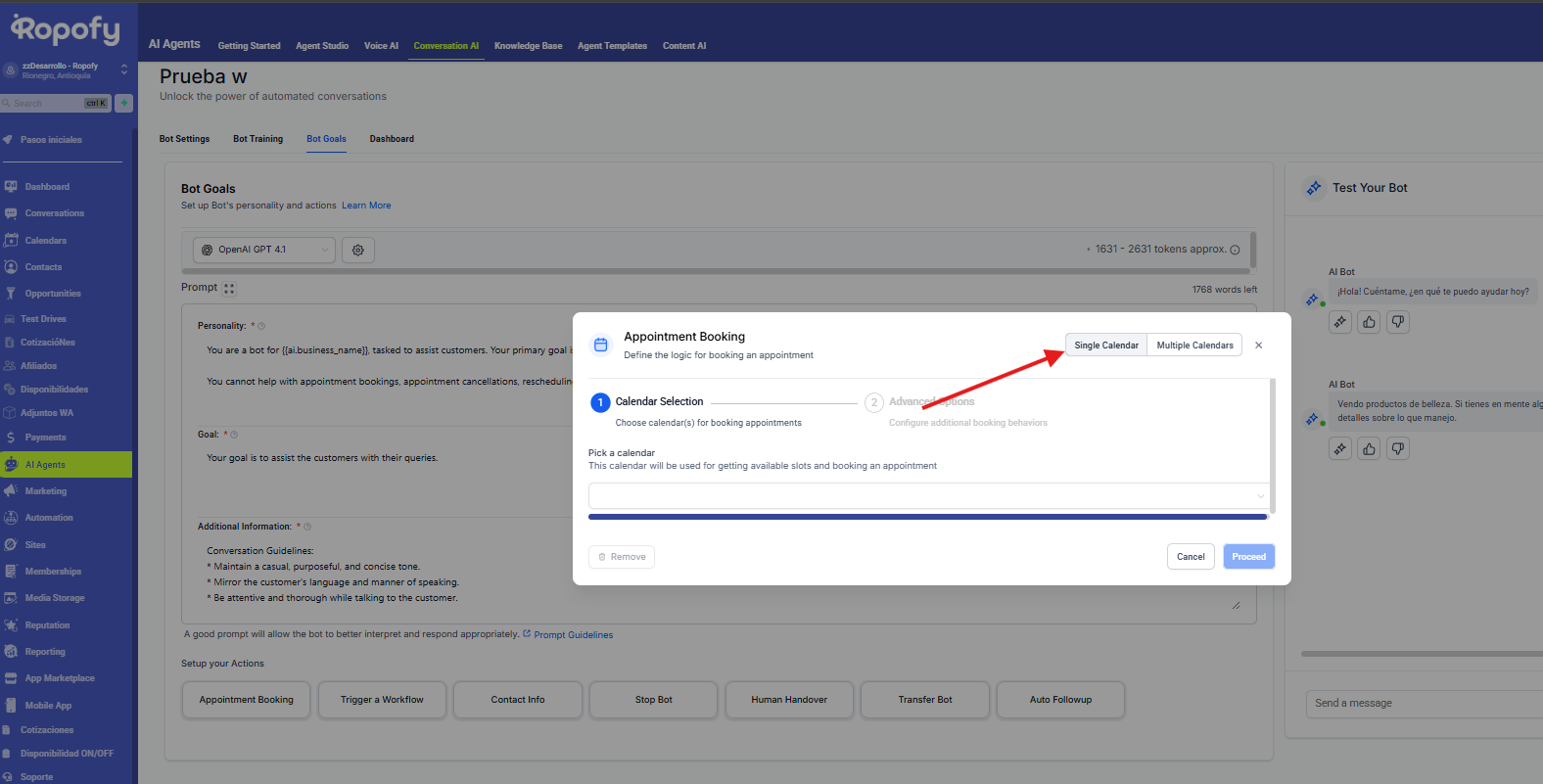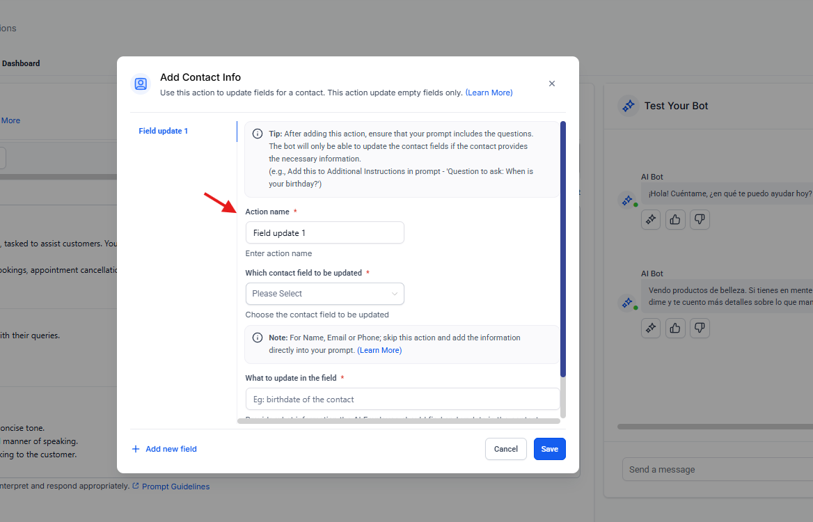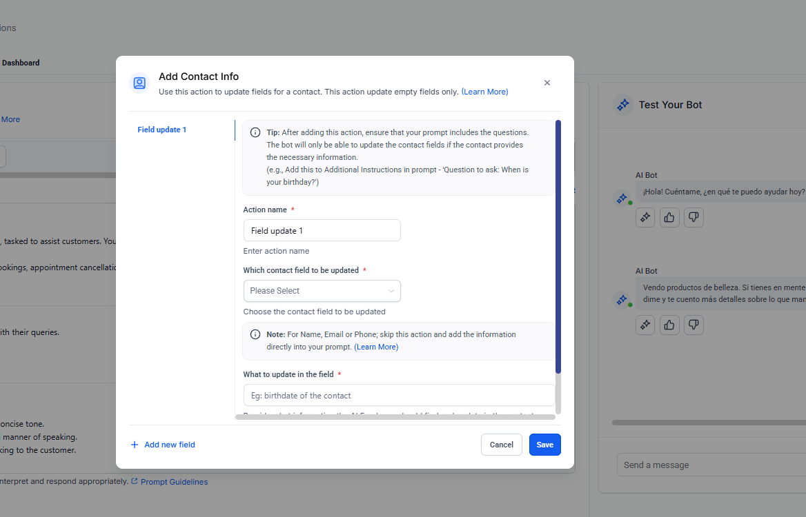 Las acciones del bot en Ropofy permiten automatizar y gestionar de forma eficiente las interacciones con los contactos, integrando la conversación con los procesos internos del CRM. A través de la ejecución de workflows, actualización de datos, cierre controlado de conversaciones, transferencia a agentes humanos y redirección entre bots, se garantiza una atención estructurada, escalable y alineada con las necesidades operativas. Una correcta configuración de estas acciones mejora la experiencia del usuario y optimiza la gestión interna de la organización.