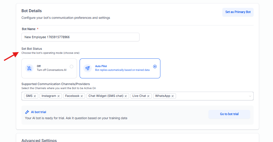 | Status | Estado operativo del agente: Off (Apagado), Auto-Pilot (Activo y respondiendo automáticamente). |