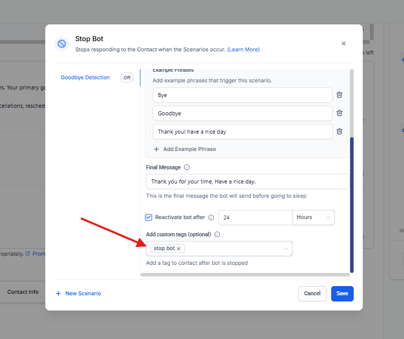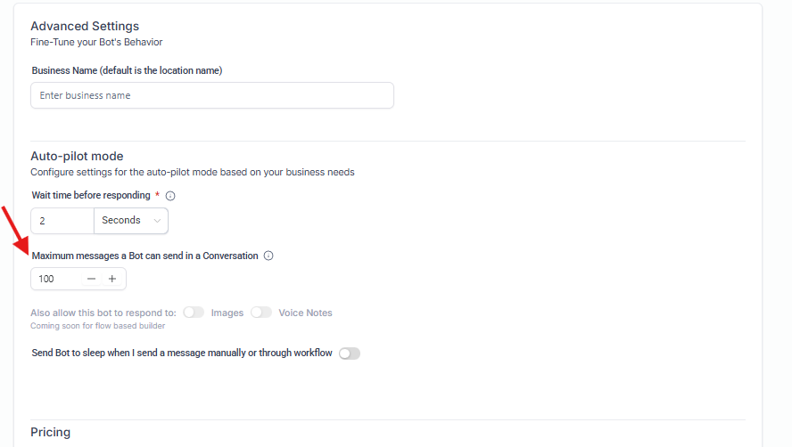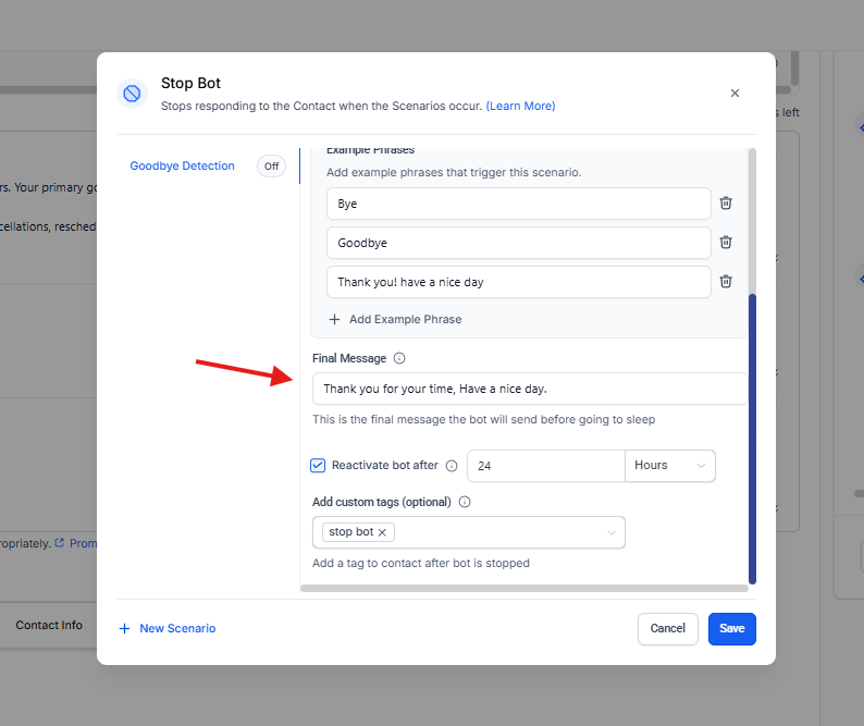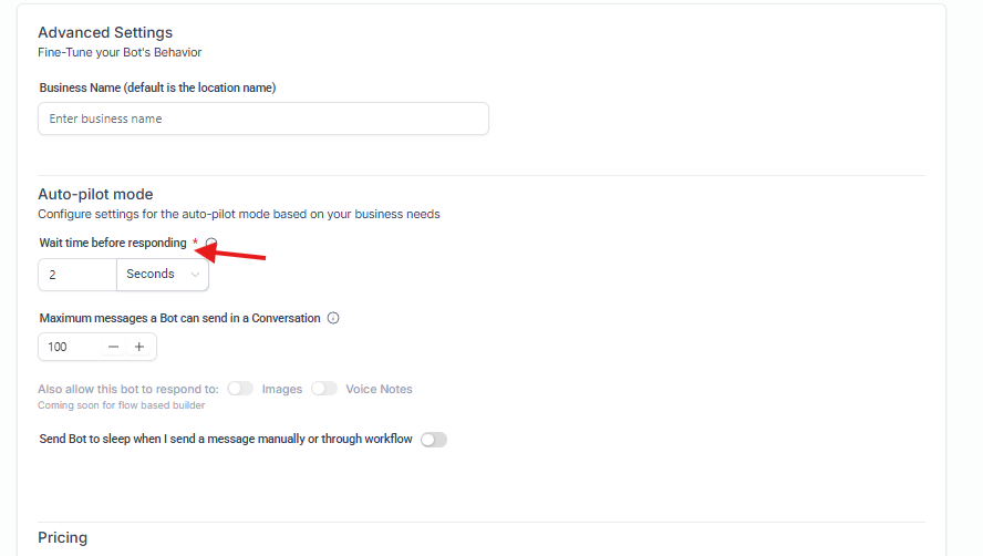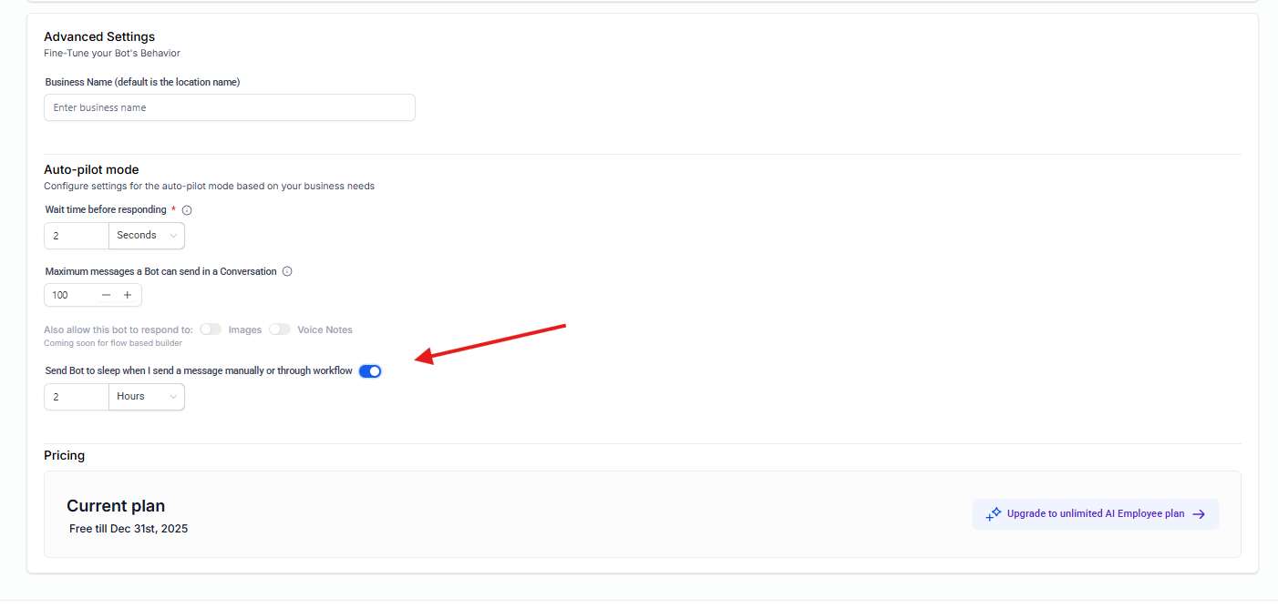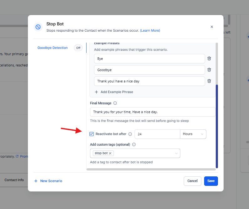 Permite definir el tiempo tras el cual el bot puede volver a responder al contacto.