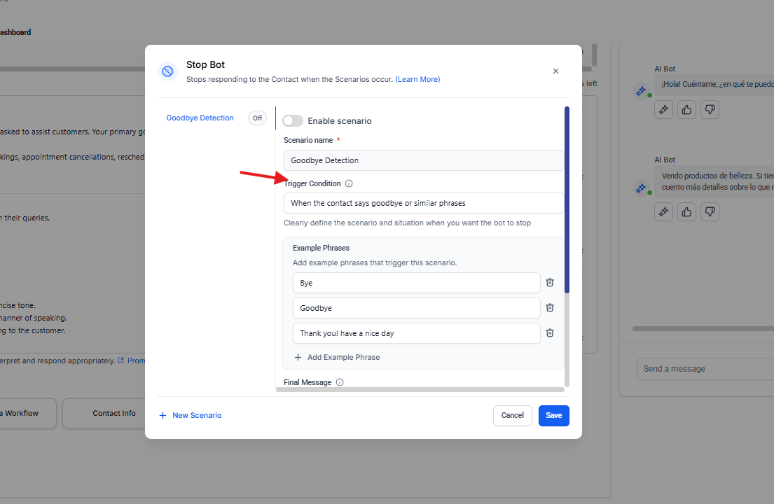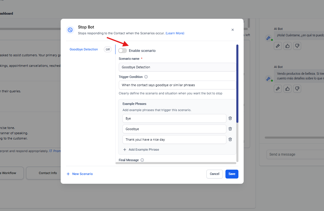 Este escenario se utiliza cuando el contacto indica que no puede continuar la conversación en ese momento.