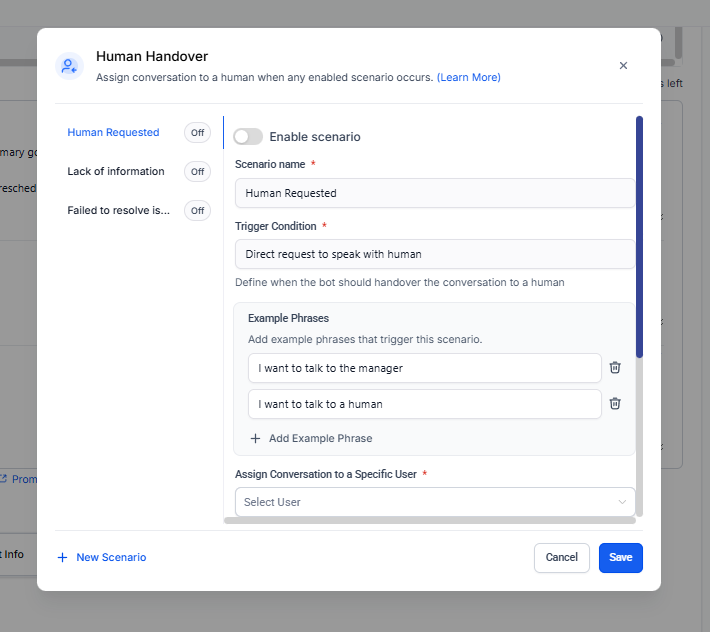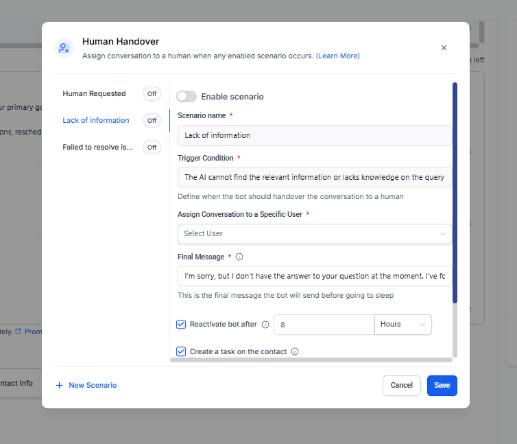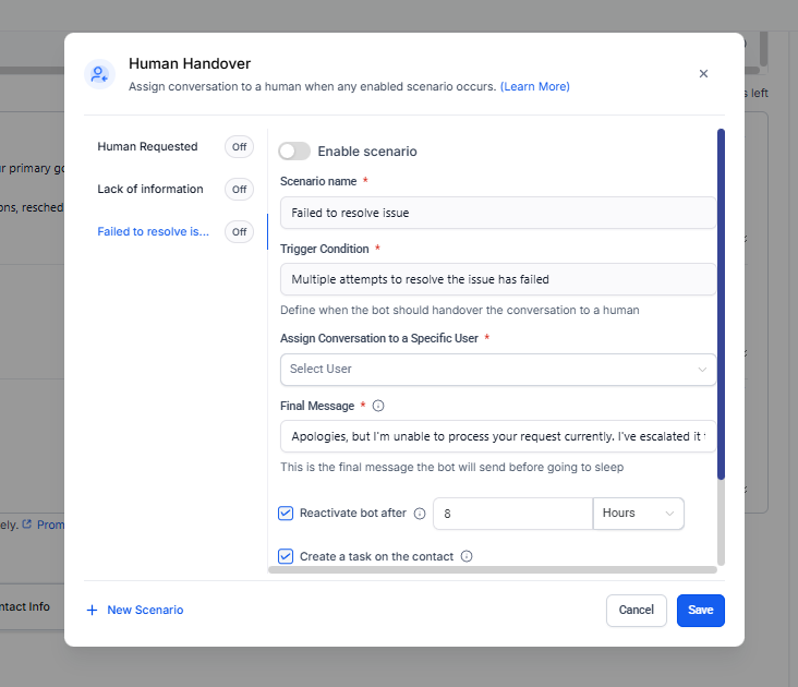 Este escenario se activa cuando el bot ha intentado resolver un problema varias veces sin éxito.