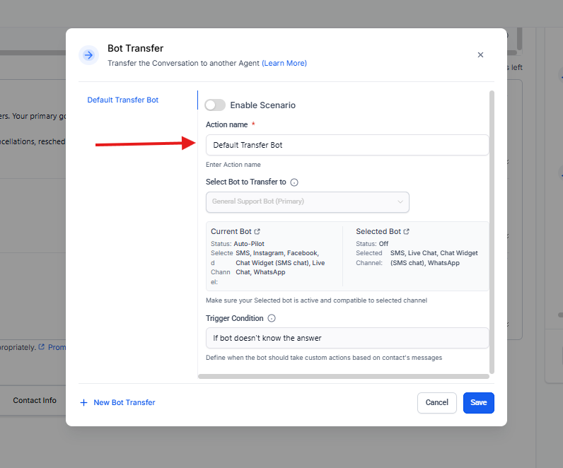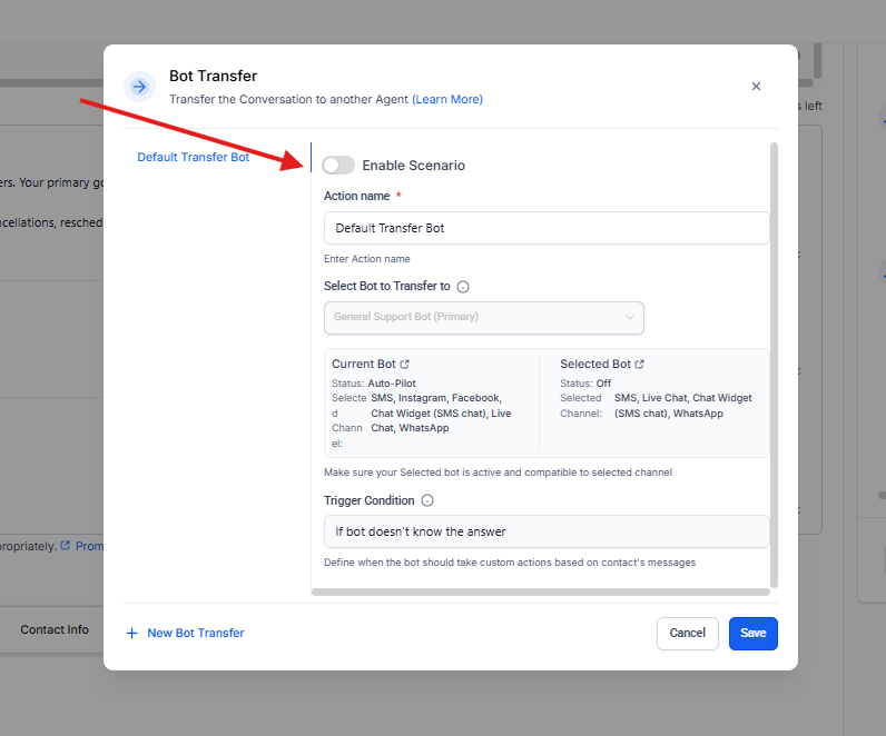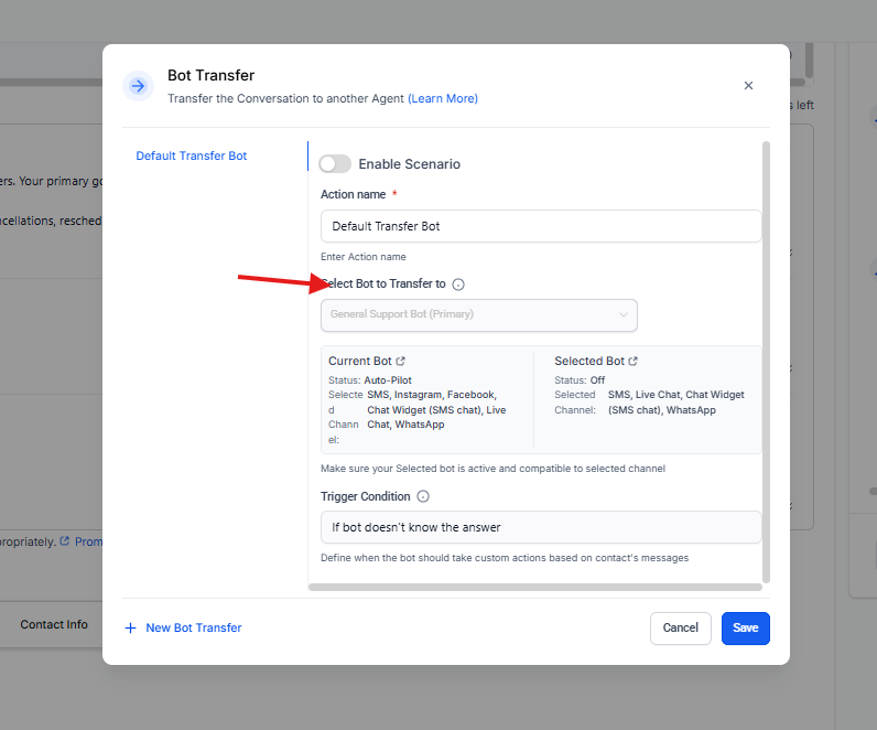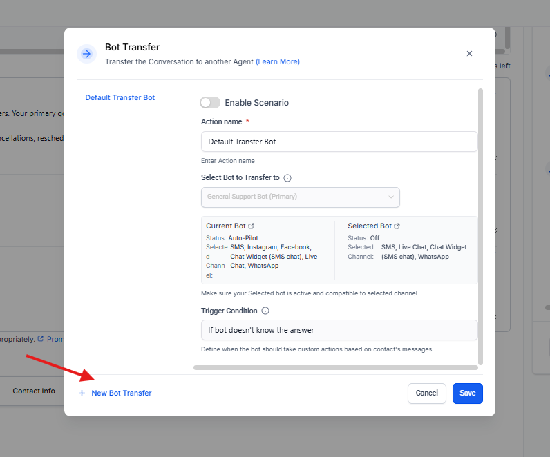 Al seleccionar Bot Transfer, se habilita la creación de uno o más escenarios de transferencia.