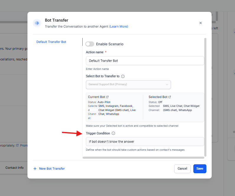 Permite crear múltiples escenarios de transferencia dentro del mismo bot, cada uno con diferentes condiciones y bots de destino.