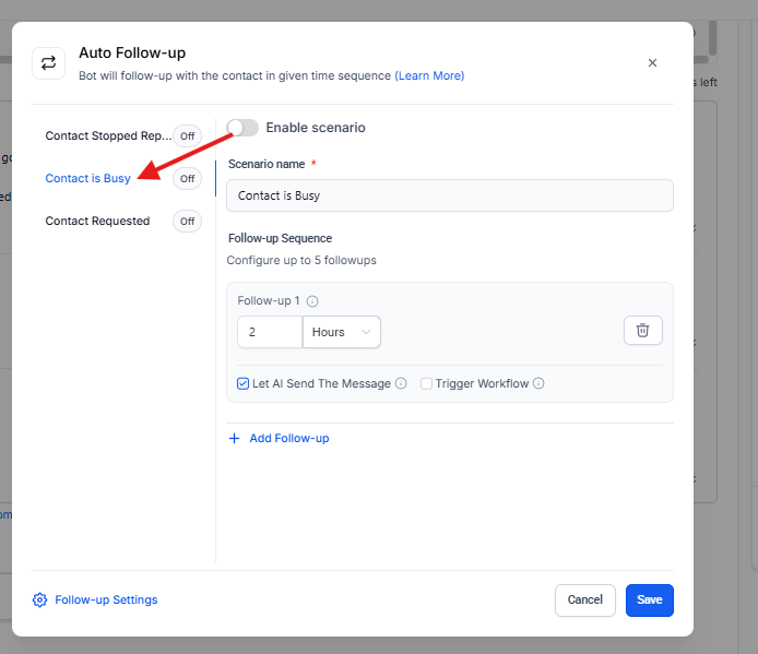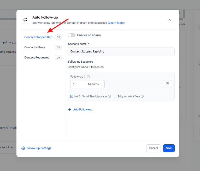 La acción Auto Follow-up permite que el bot de IA realice seguimientos automáticos a un contacto cuando se cumple una condición específica y no se recibe respuesta dentro de un tiempo determinado. Esta funcionalidad es ideal para mantener la conversación activa sin intervención humana.
