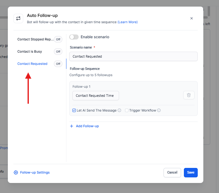 Desde la opción Follow-up Settings, se pueden definir reglas globales para todos los escenarios: