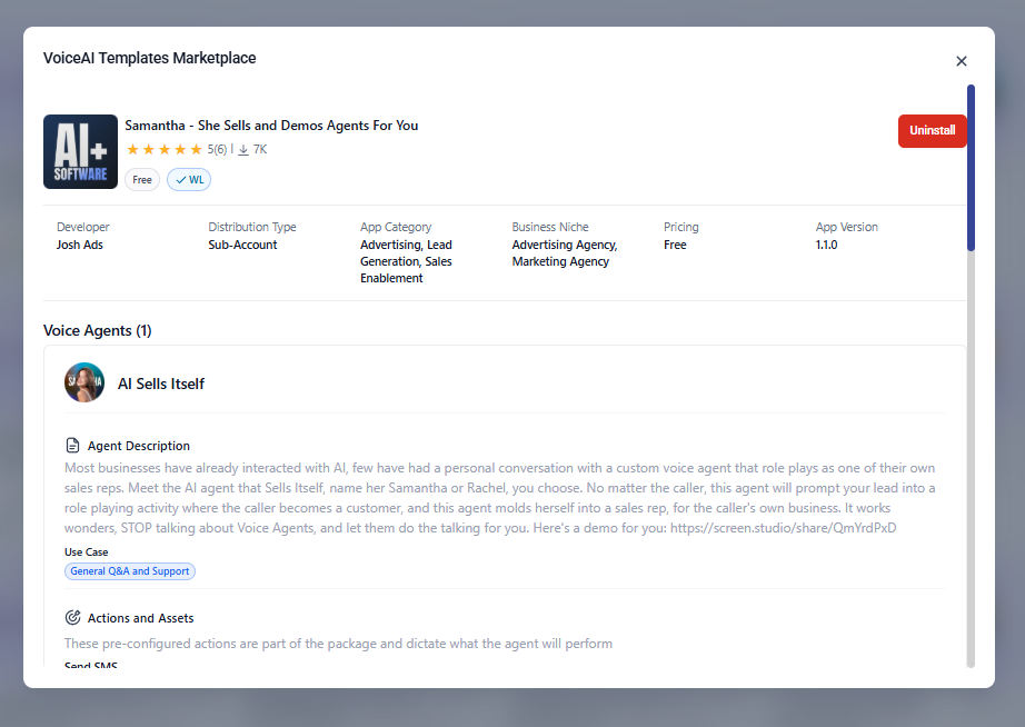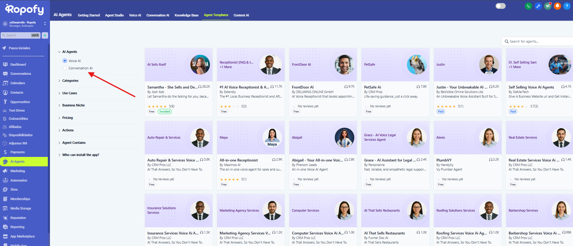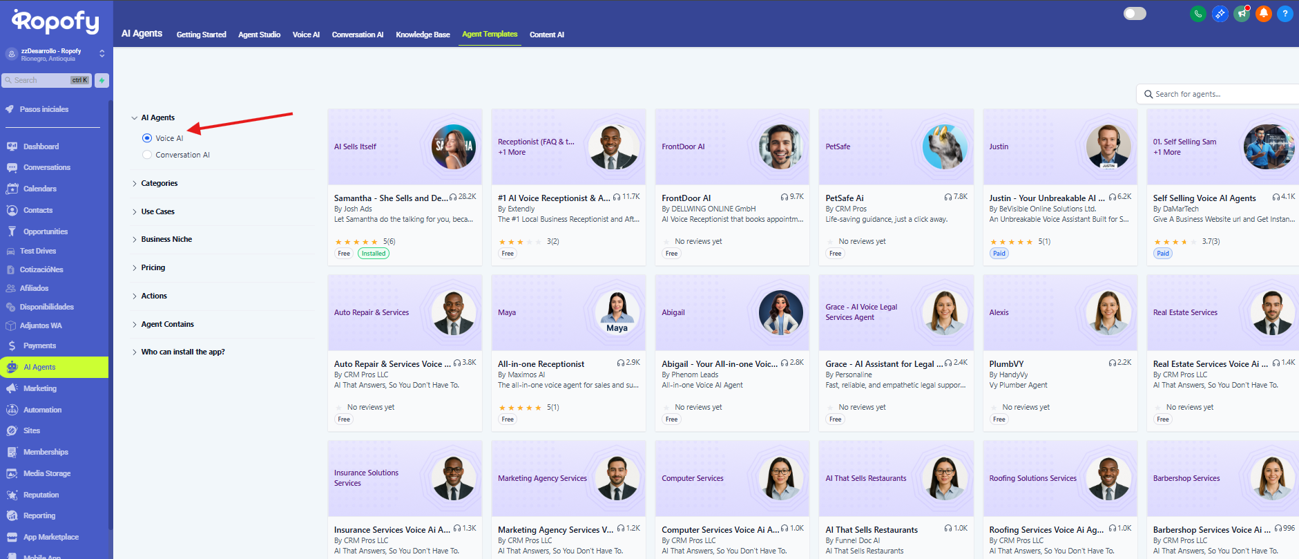 Este apartado funciona como un marketplace de agentes de inteligencia artificial preconfigurados que pueden instalarse y adaptarse fácilmente a distintos negocios y casos de uso.