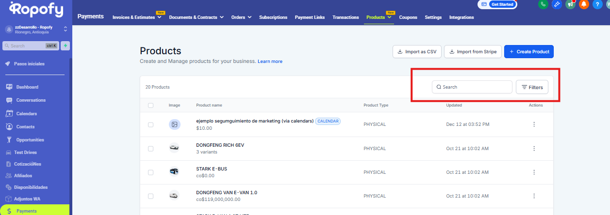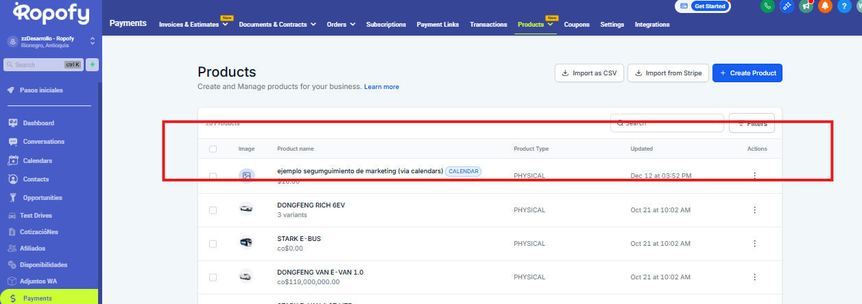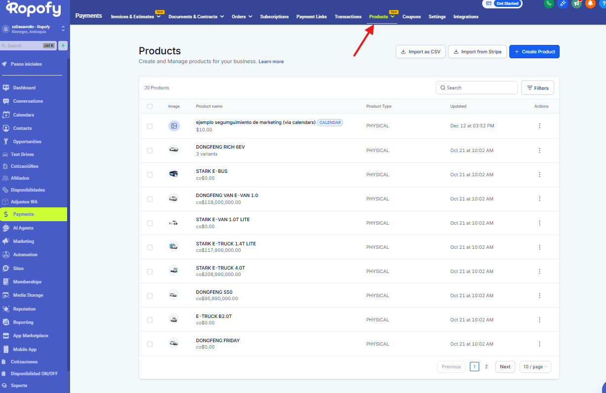 La vista Products permite crear, importar y administrar los productos del negocio.