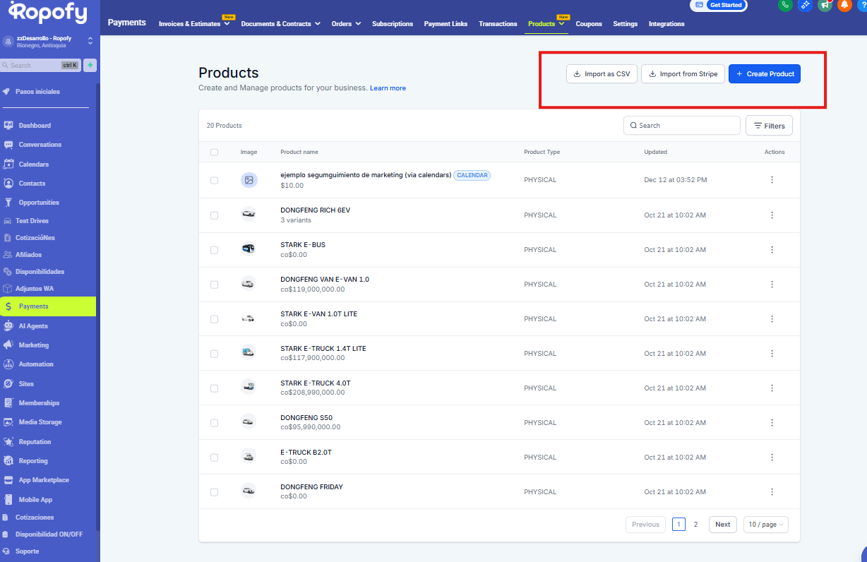 Permite importar productos mediante un archivo CSV.Import from Stripe
