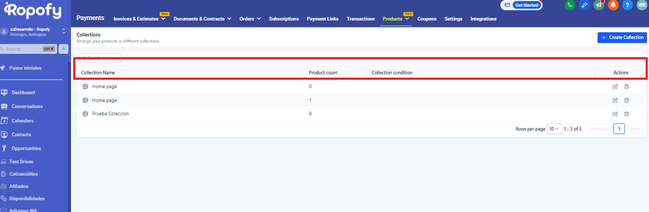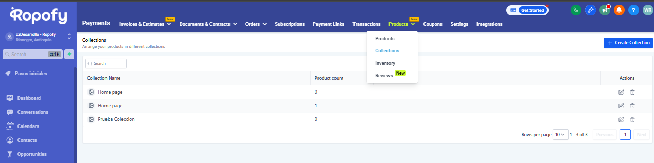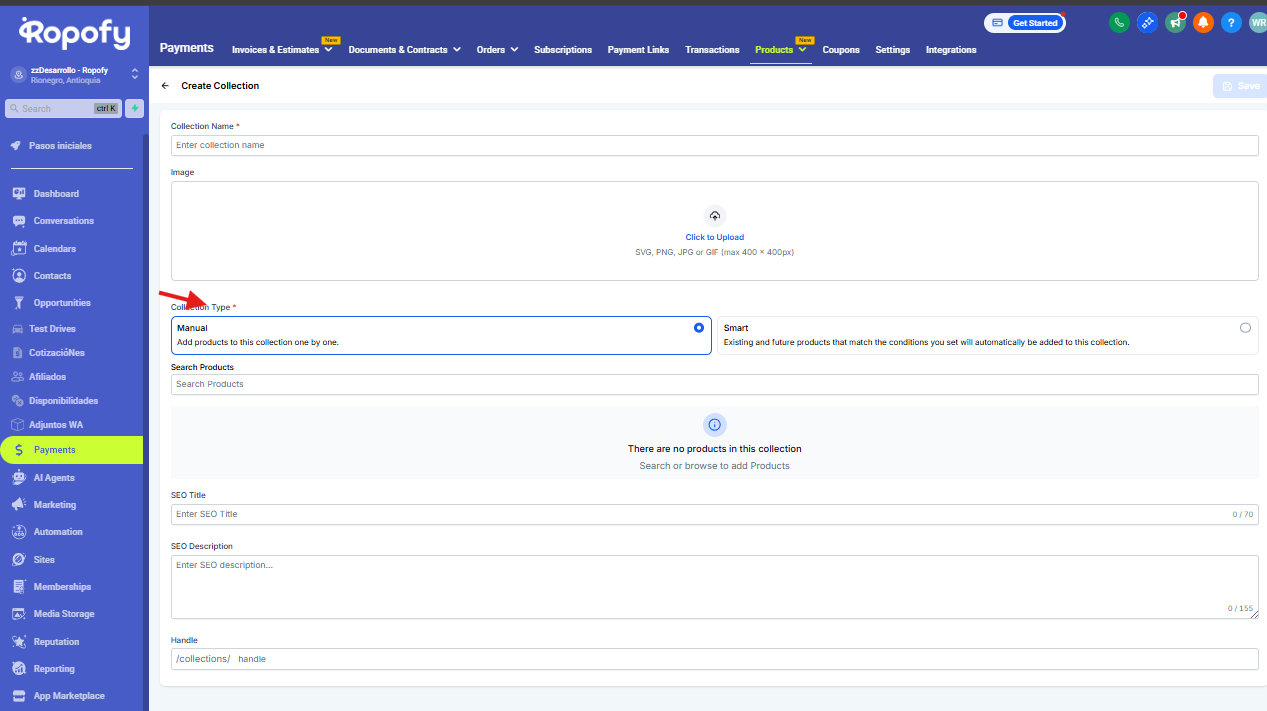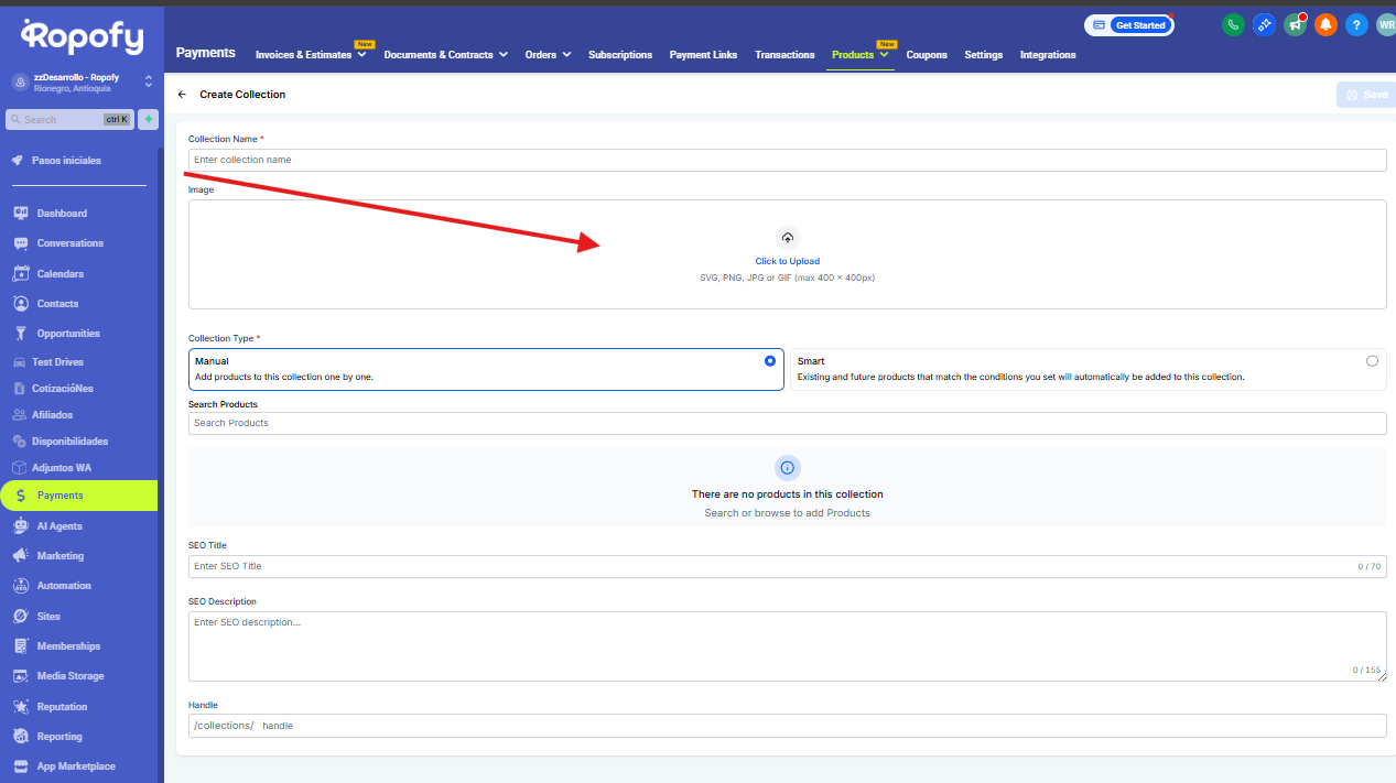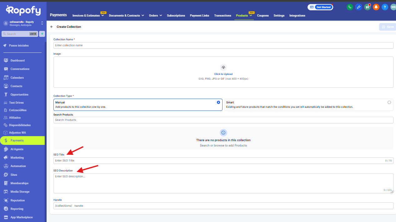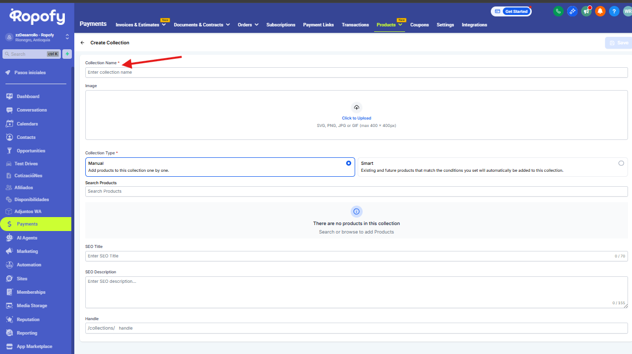 La sección Collections permite agrupar productos en colecciones para su organización y visualización.