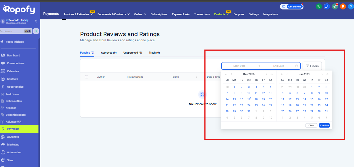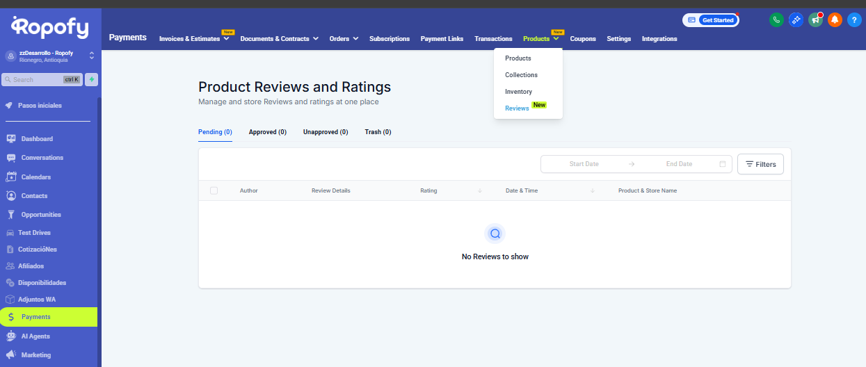 Esta sección permite gestionar y moderar las reseñas y calificaciones de productos.