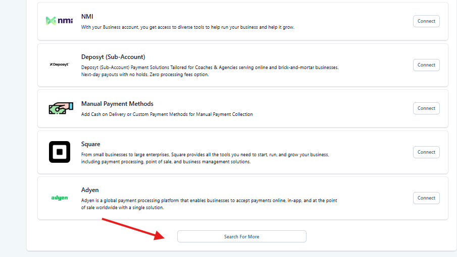 La sección More Providers muestra la lista de proveedores de pago disponibles para conectar. Cada proveedor se presenta como una tarjeta independiente.