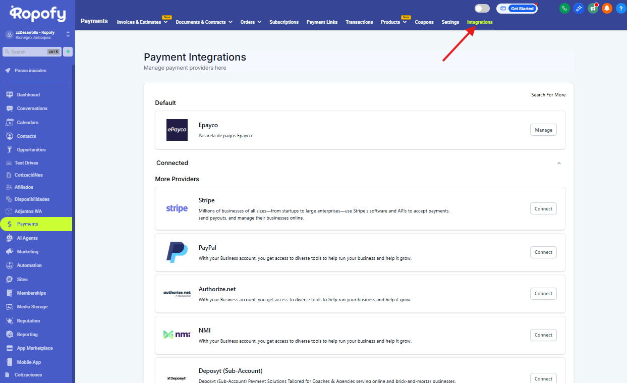 La pestaña Integrations permite conectar, administrar y definir proveedores de pago que el sistema utilizará para procesar cobros. Cada proveedor funciona como una integración independiente, lo que significa que su conexión, configuración y métodos de pago no dependen de otros proveedores.