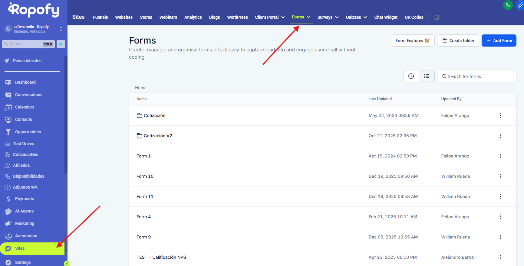 Desde la sección Forms, el usuario puede visualizar todos los formularios existentes dentro de la cuenta.