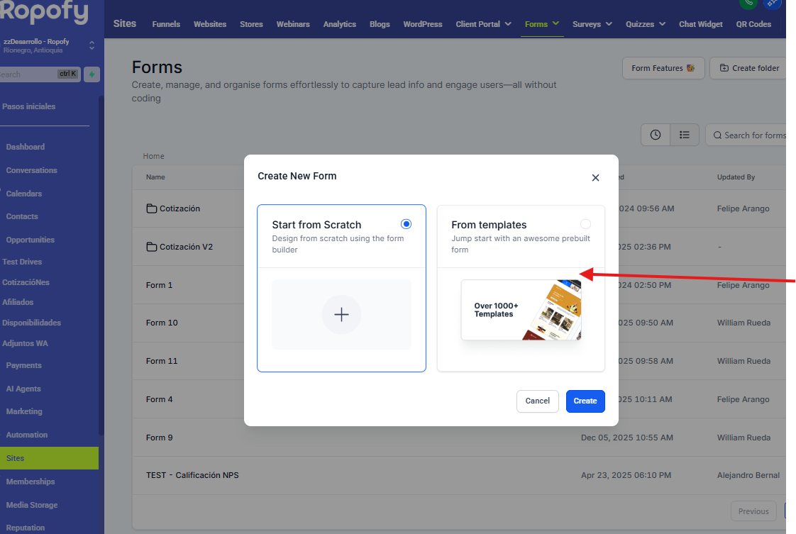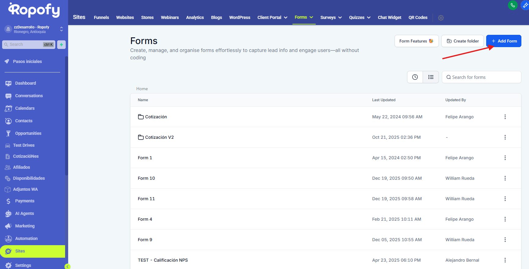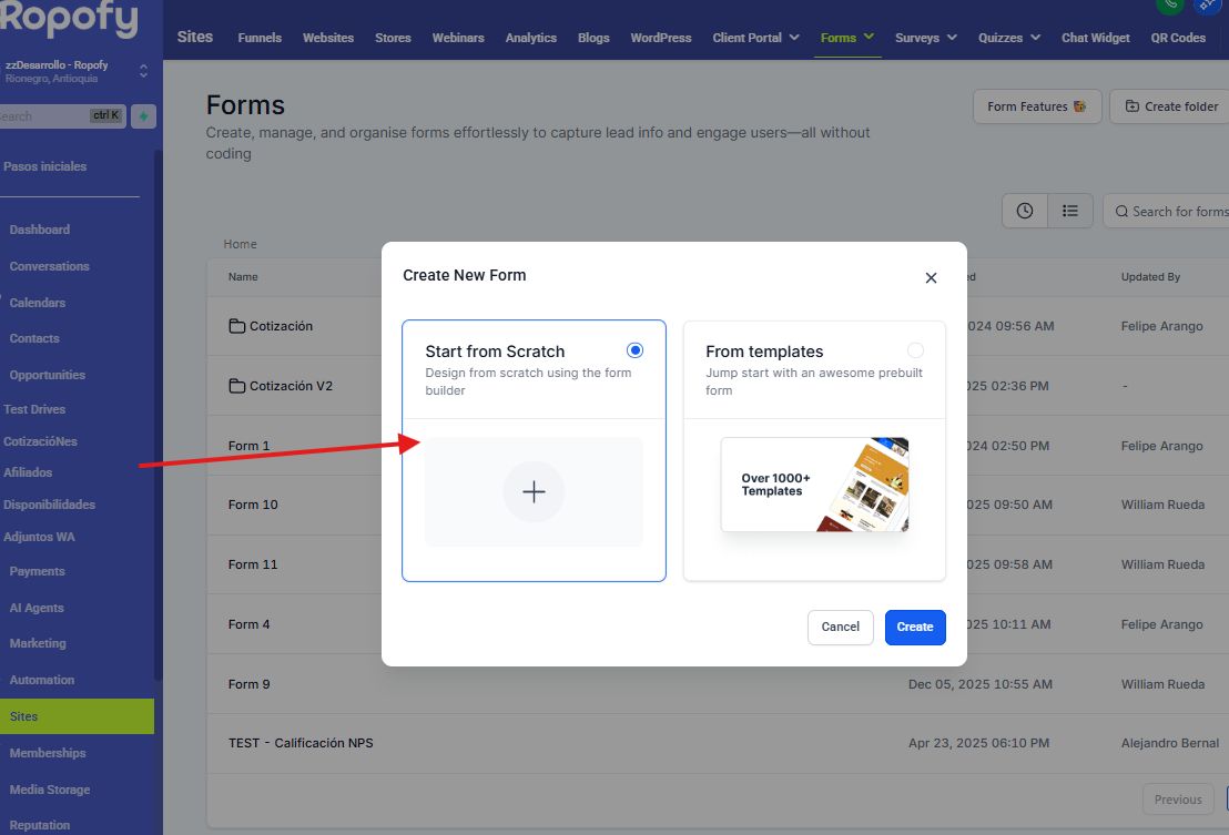 El módulo de Forms en Ropofy permite crear, administrar, configurar y distribuir formularios de manera sencilla, con el objetivo de capturar información de leads, clientes o usuarios sin necesidad de conocimientos técnicos o programación.