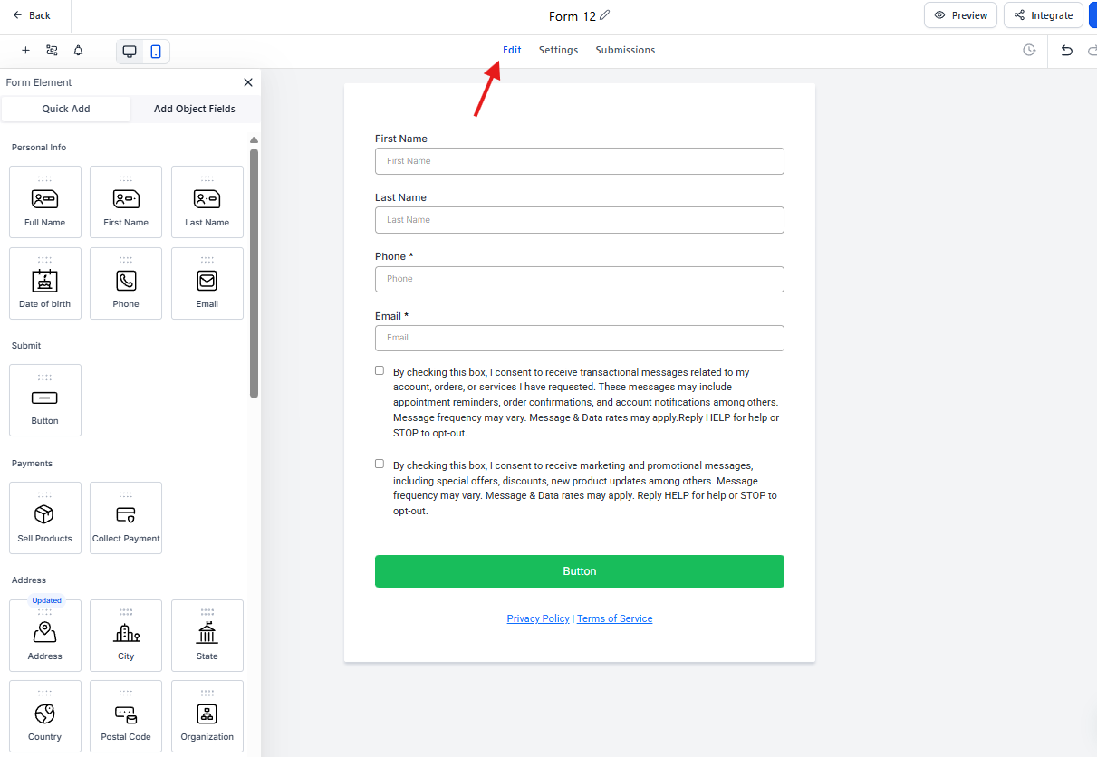 La pestaña Edit corresponde al entorno visual del formulario.