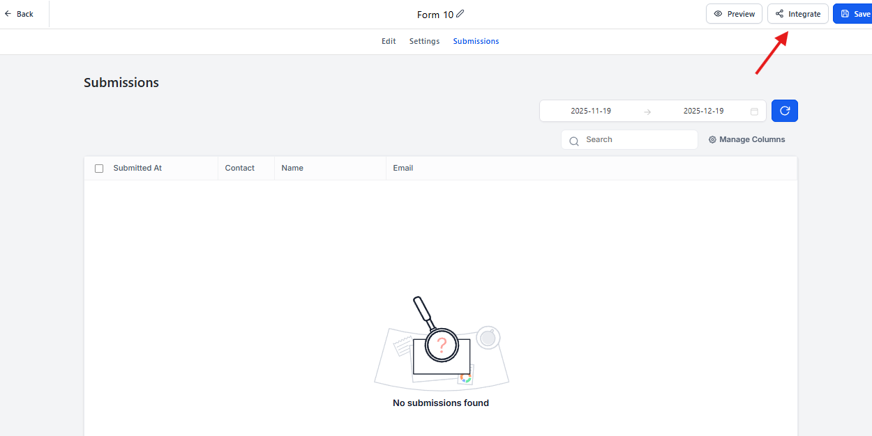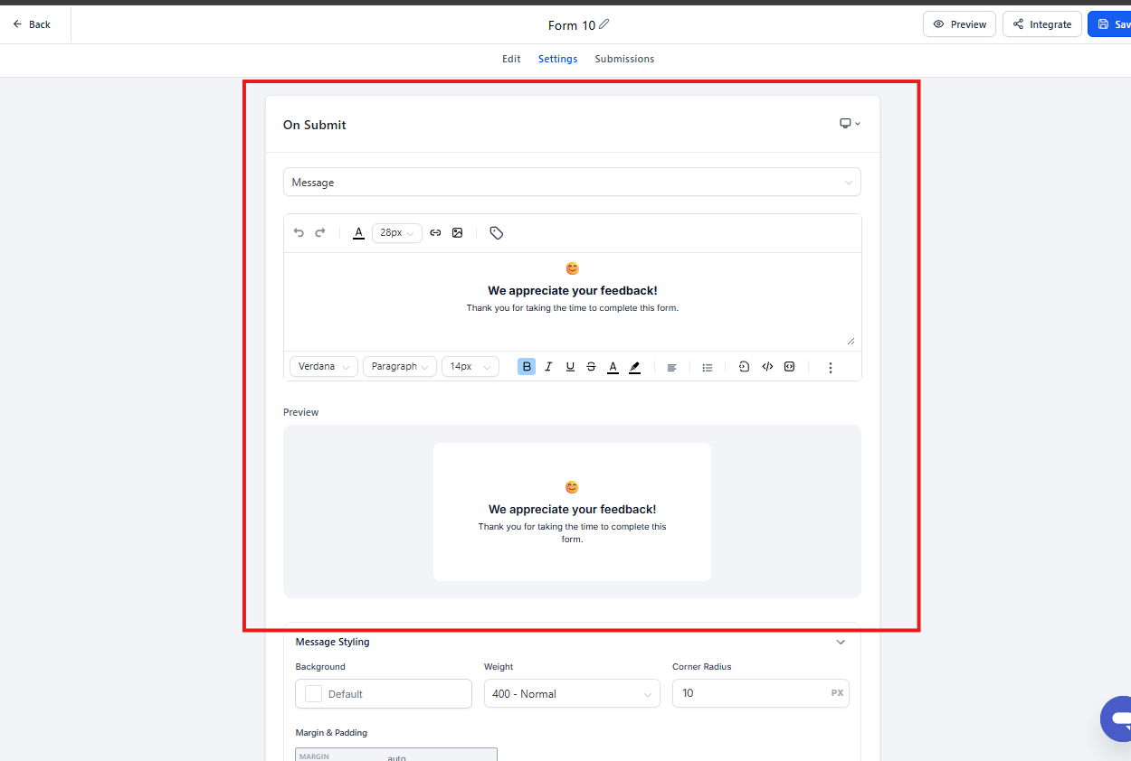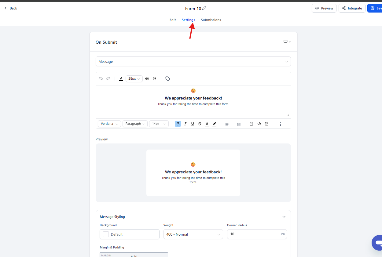 La pestaña Settings permite configurar el comportamiento del formulario una vez que el usuario lo envía, así como integraciones y ajustes generales.