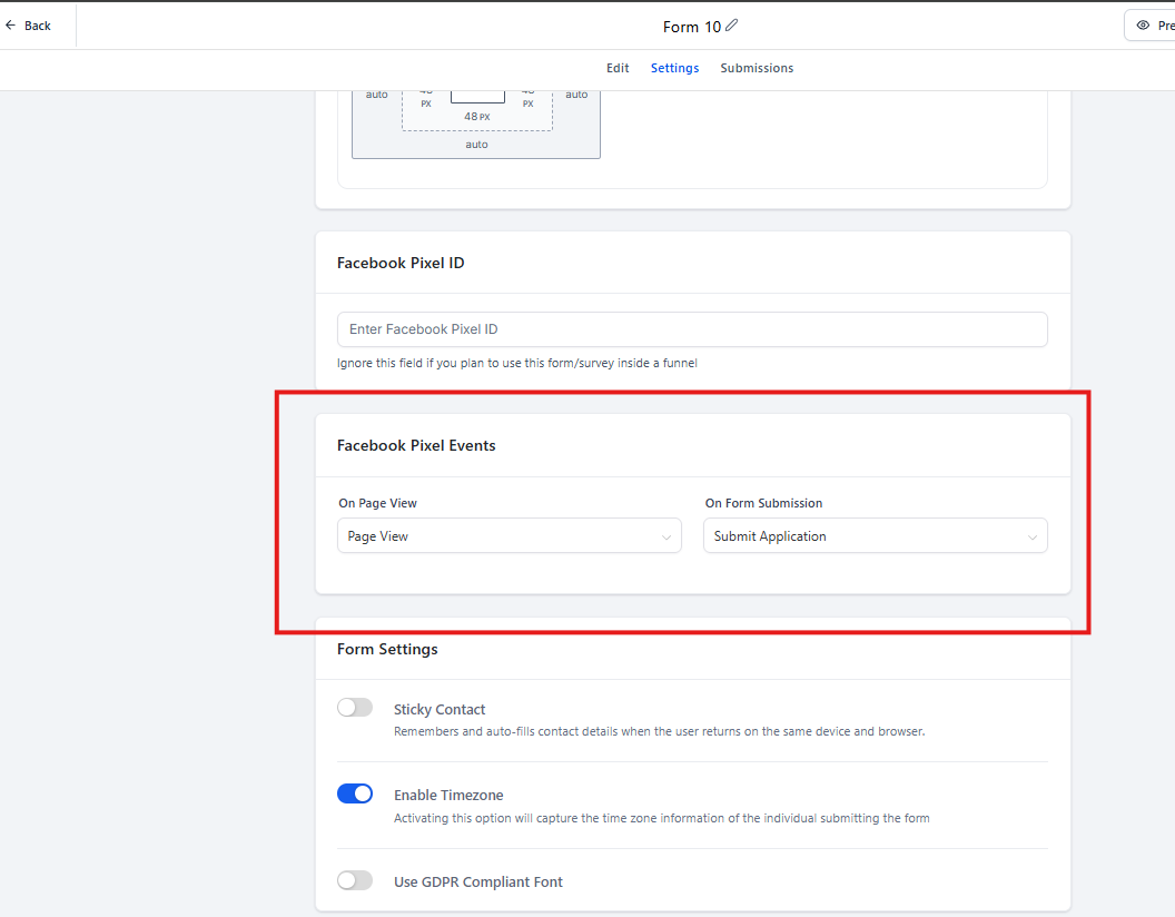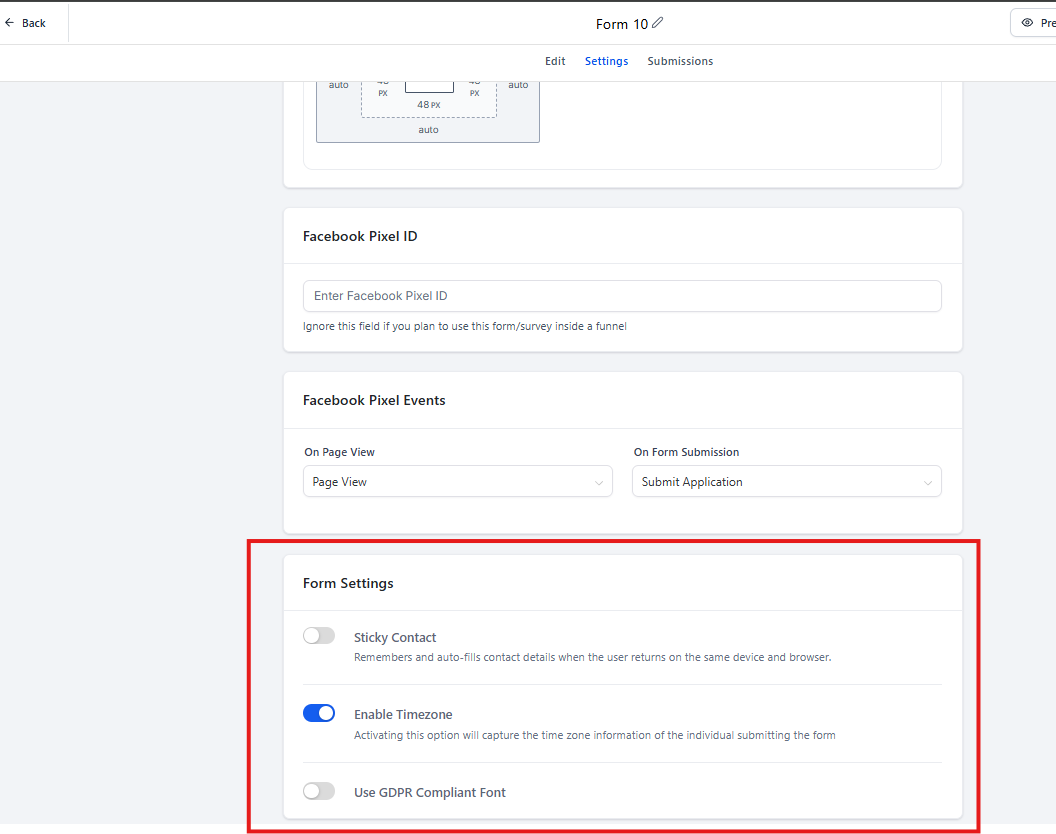 Dentro de Form Settings, se encuentran opciones como: