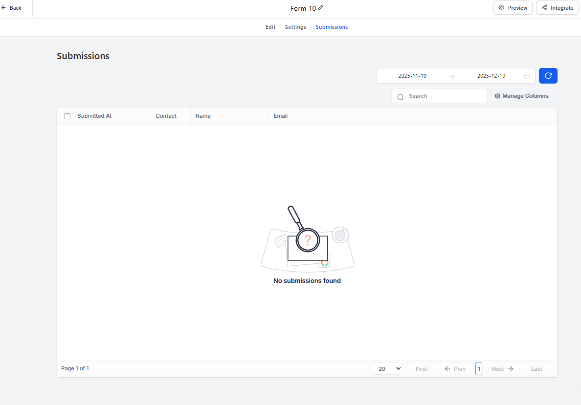 La pestaña Submissions permite visualizar y gestionar todas las respuestas recibidas a través del formulario.