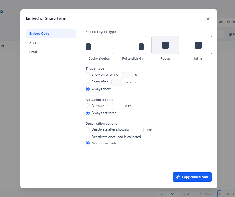 Finalmente, se puede copiar el código de inserción para integrarlo en sitios web, funnels o páginas externas.