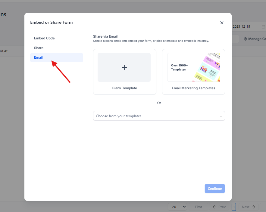 Al hacer clic en Add Form, se despliega una ventana modal para iniciar la creación del formulario, donde se ofrecen dos opciones:
