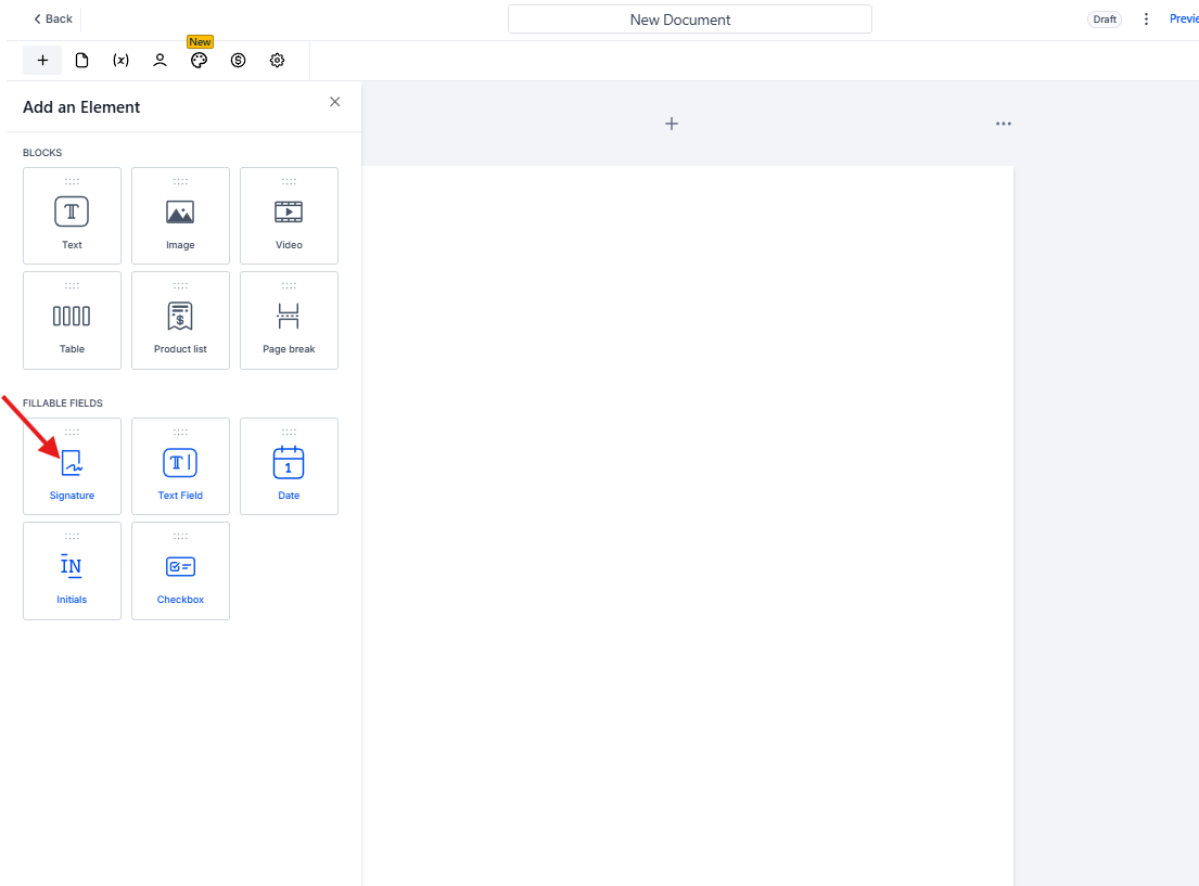 Al crear o editar un documento desde el módulo Documents & Contracts, el usuario puede agregar campos rellenables. Entre estos se encuentra el campo Signature, el cual se utiliza para solicitar la firma del cliente.