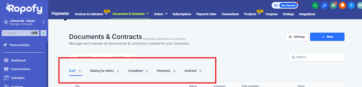 Desde el apartado principal Documents & Contracts, el usuario puede: