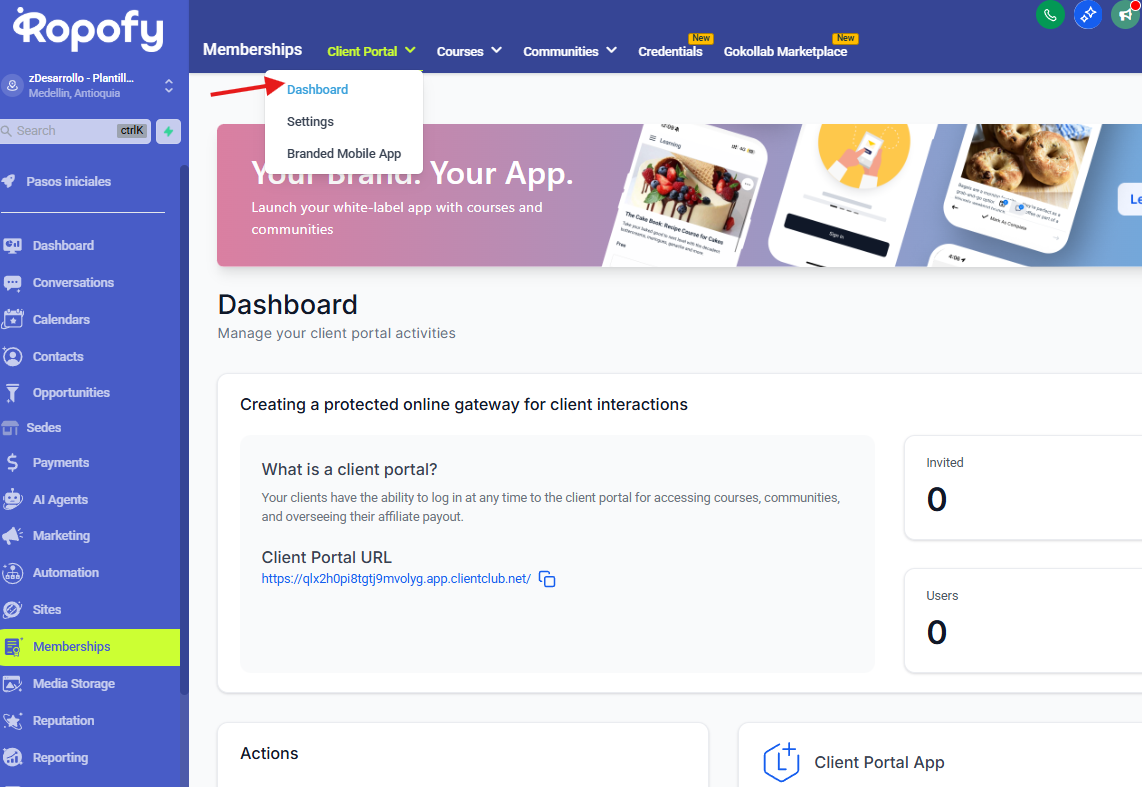 El módulo Client Portal se encuentra dentro del menú superior de Memberships.