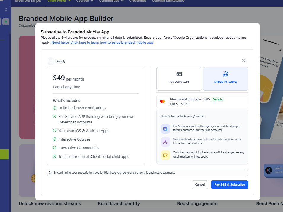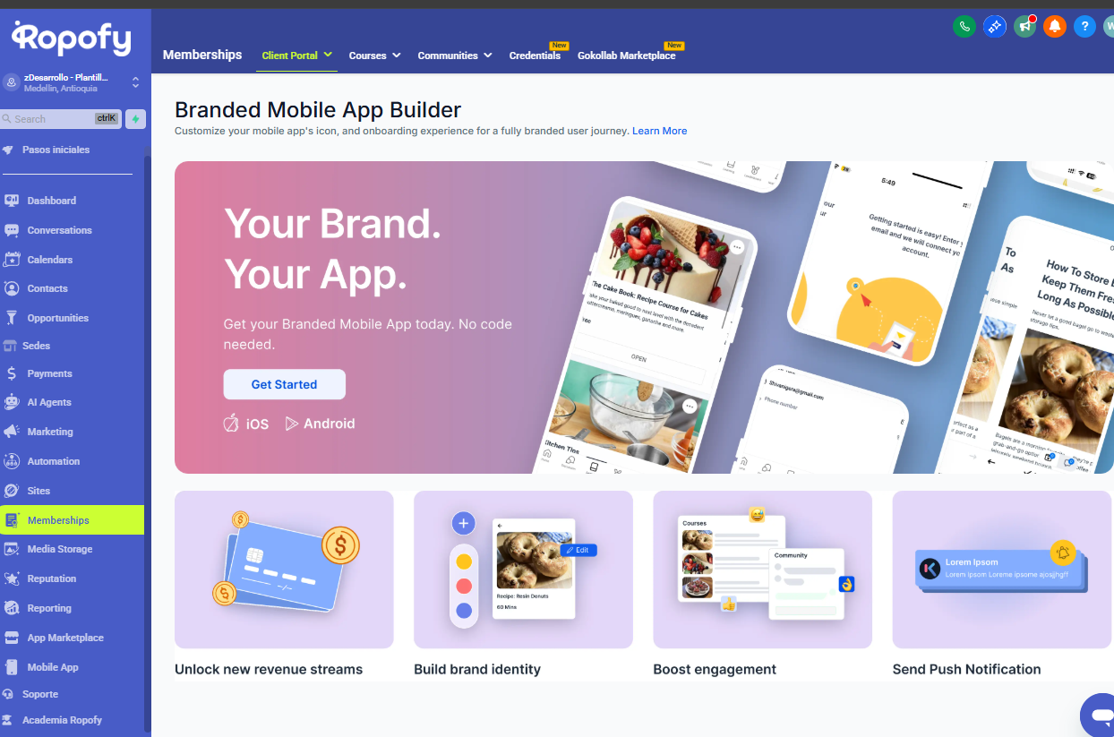 La sección Branded Mobile App permite crear una aplicación móvil personalizada basada en el Client Portal.