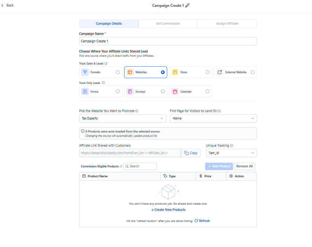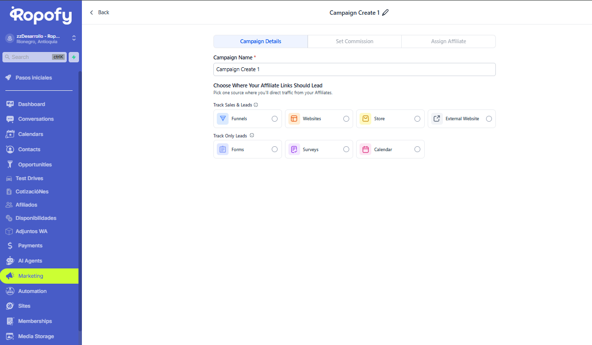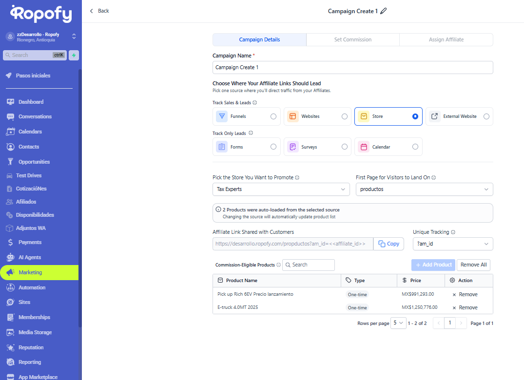 Una vez creada, la campaña de afiliación en Ropofy estará lista para ser promocionada por los afiliados mediante enlaces únicos, permitiendo un seguimiento preciso de leads, ventas y comisiones.