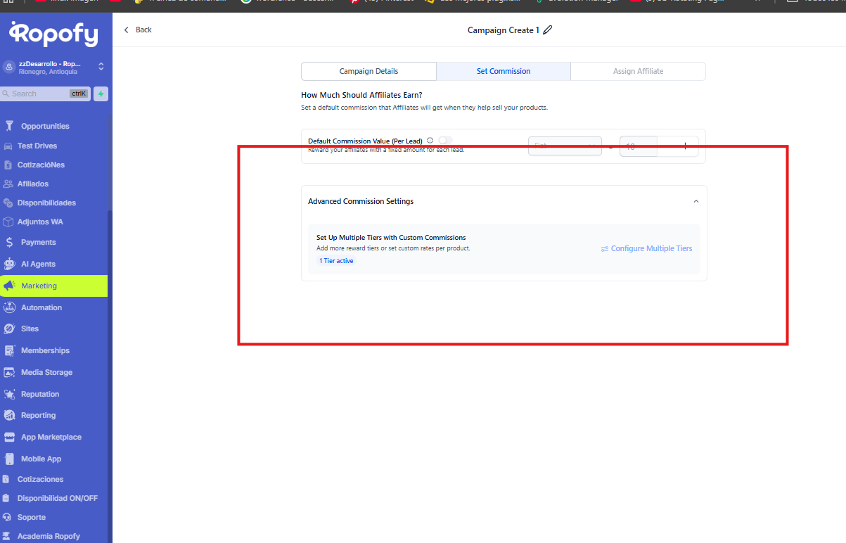 En esta sección se define cuánto ganarán los afiliados por cada lead o conversión generada tener en cuenta que si se desea que el procentaje sea pro producto vendido el metdo de activacion debe contener este producto como los funnels,Websites y Stores.
