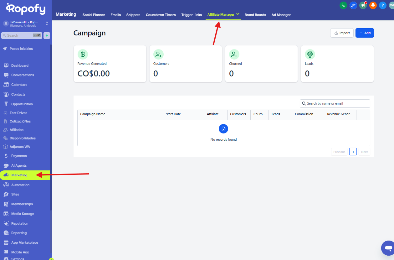 - En el menú lateral izquierdo, dirígete a Marketing.