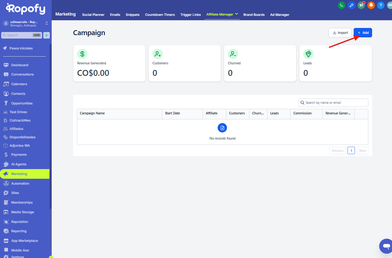 - Haz clic en el botón Add para crear una nueva campaña de afiliación.