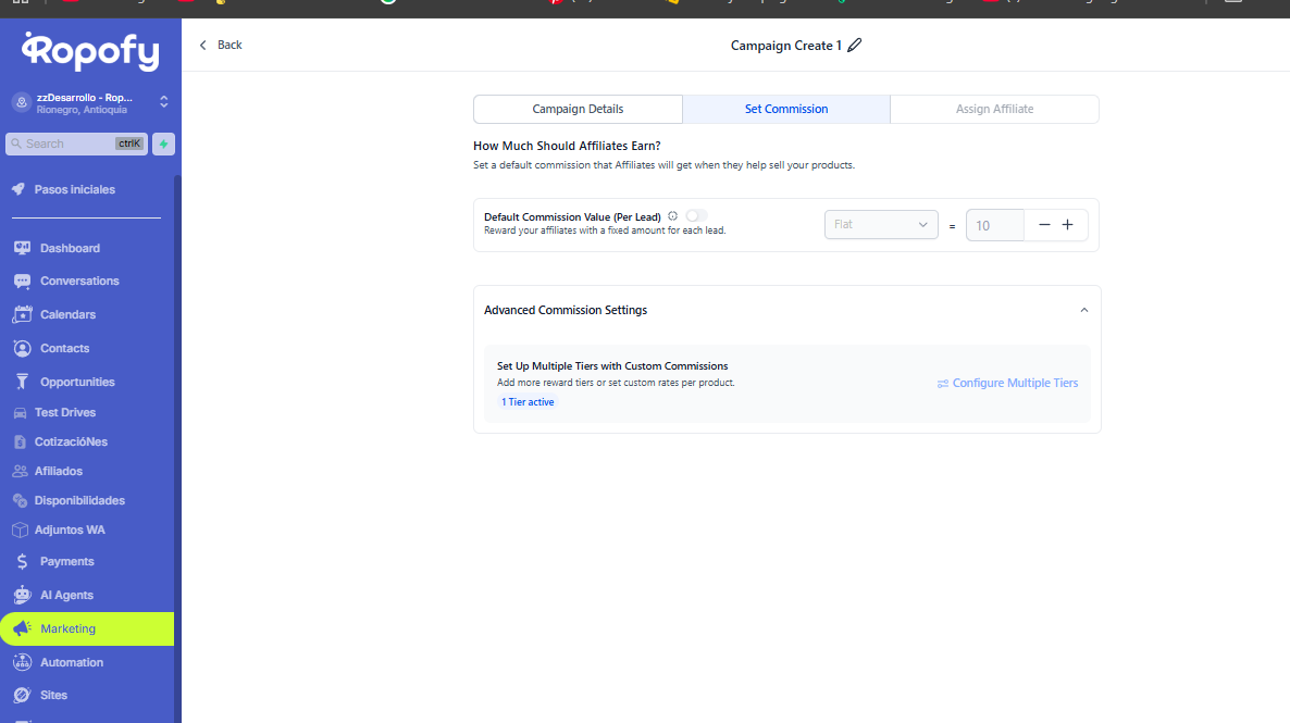 - Default Commission Value (Per Lead): Define la comisión base que recibirán los afiliados.