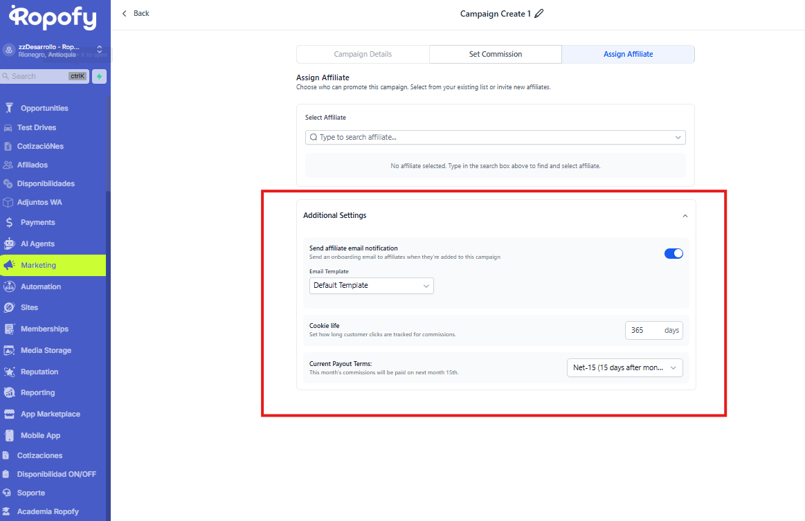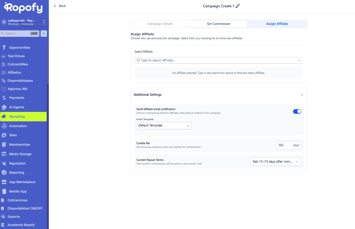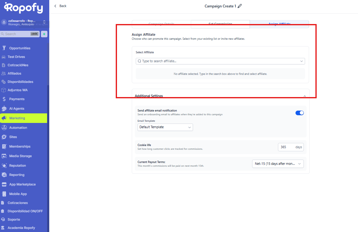 Paso 3: Assign Affiliate (Asignar afiliados)
