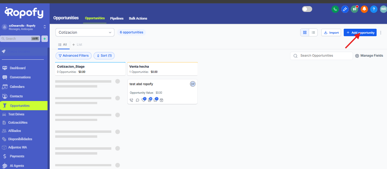 - Las oportunidades se crearán dentro del pipeline correspondiente.
