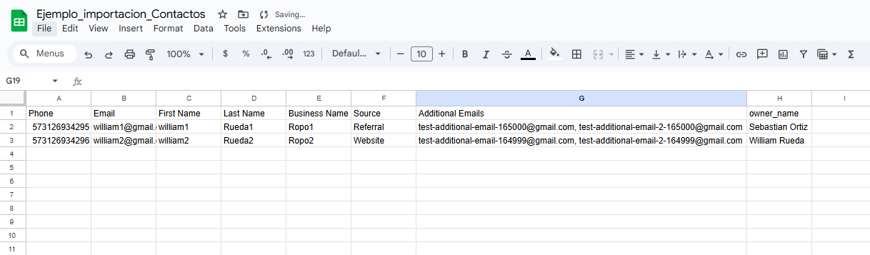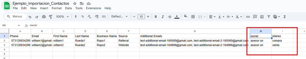Además de los campos básicos del contacto, el archivo debe incluir dos columnas clave: