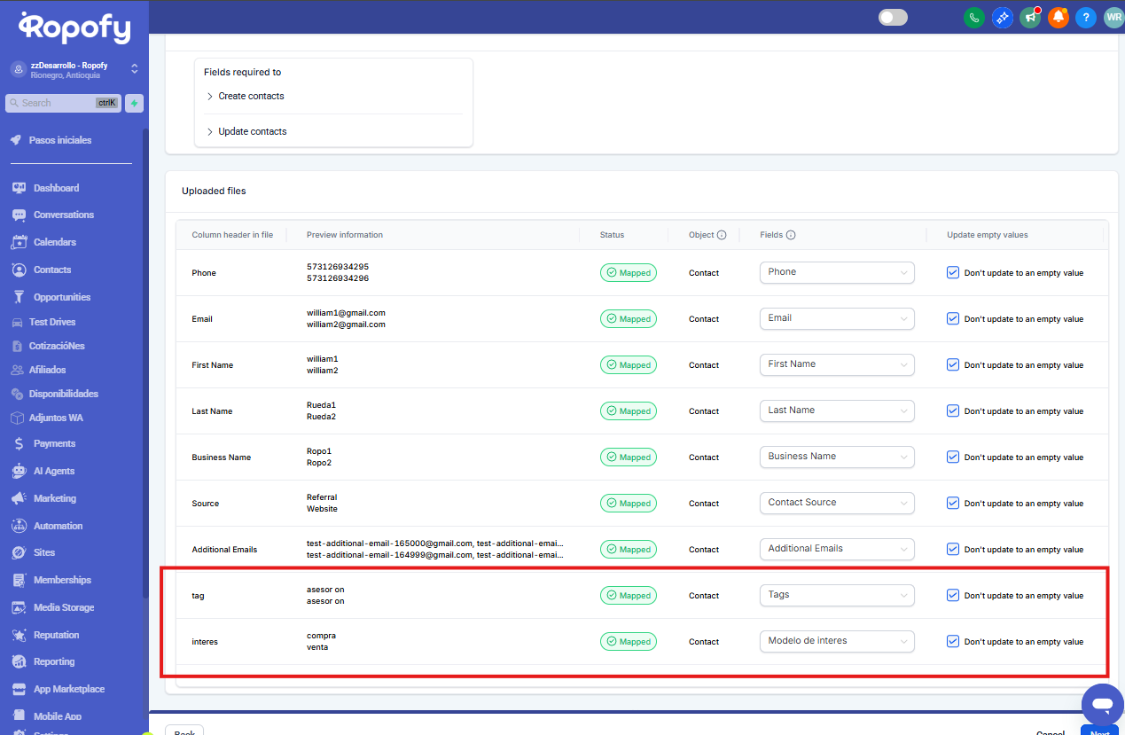 2. Importación con asignación mediante Tag y Campo Personalizado