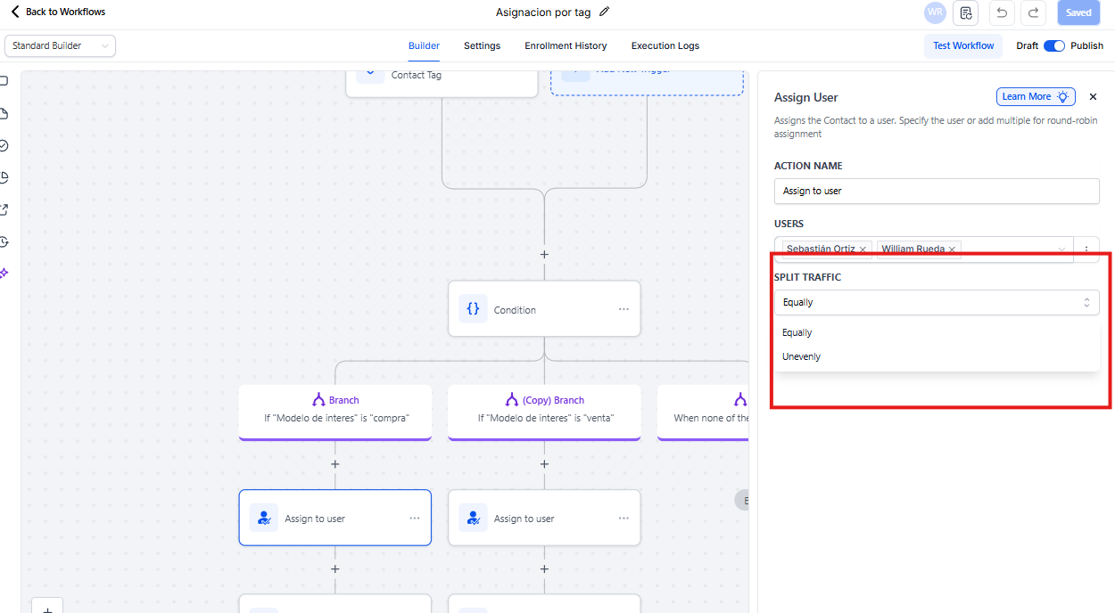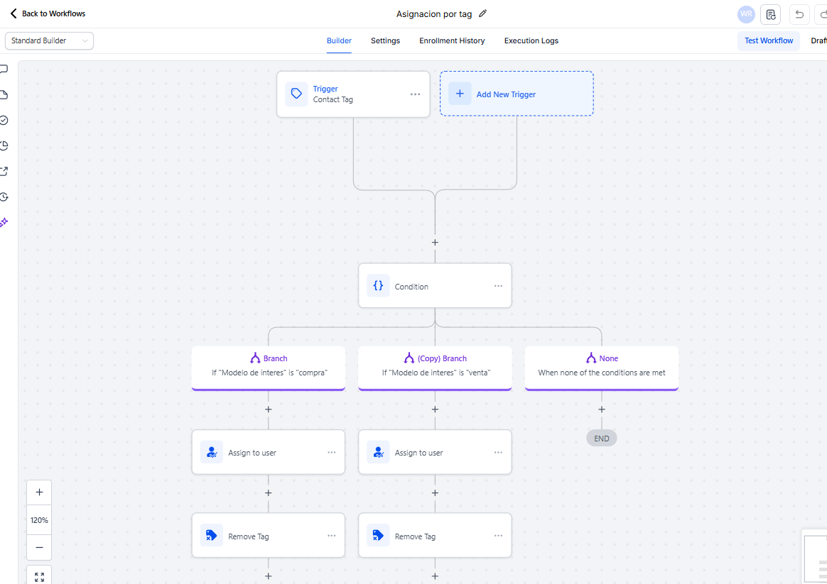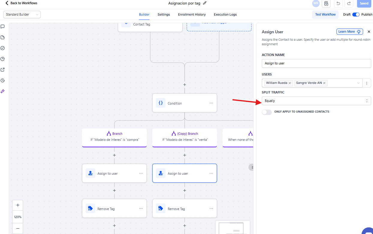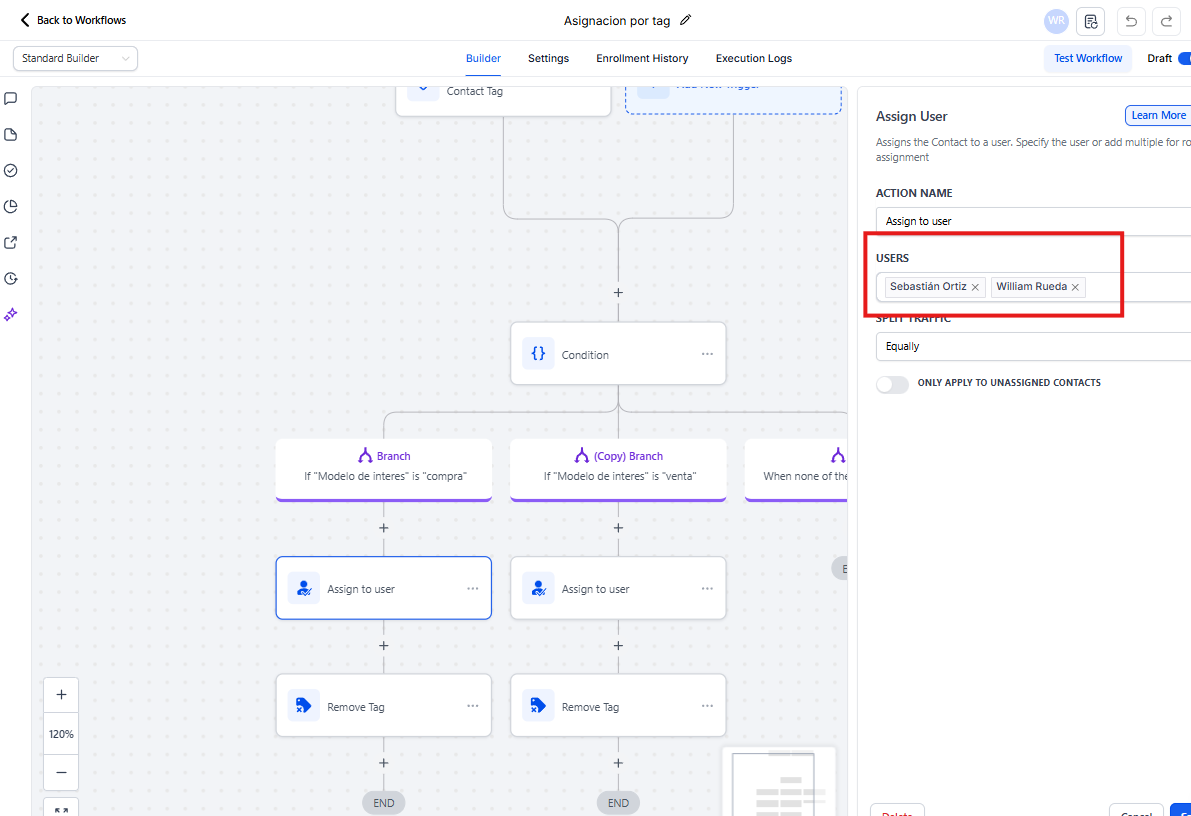 Dentro de cada rama del workflow (definida por el valor del campo Modelo de interes), se ejecuta una acción Assign to user, cuya función es asignar el owner del contacto de forma automática.