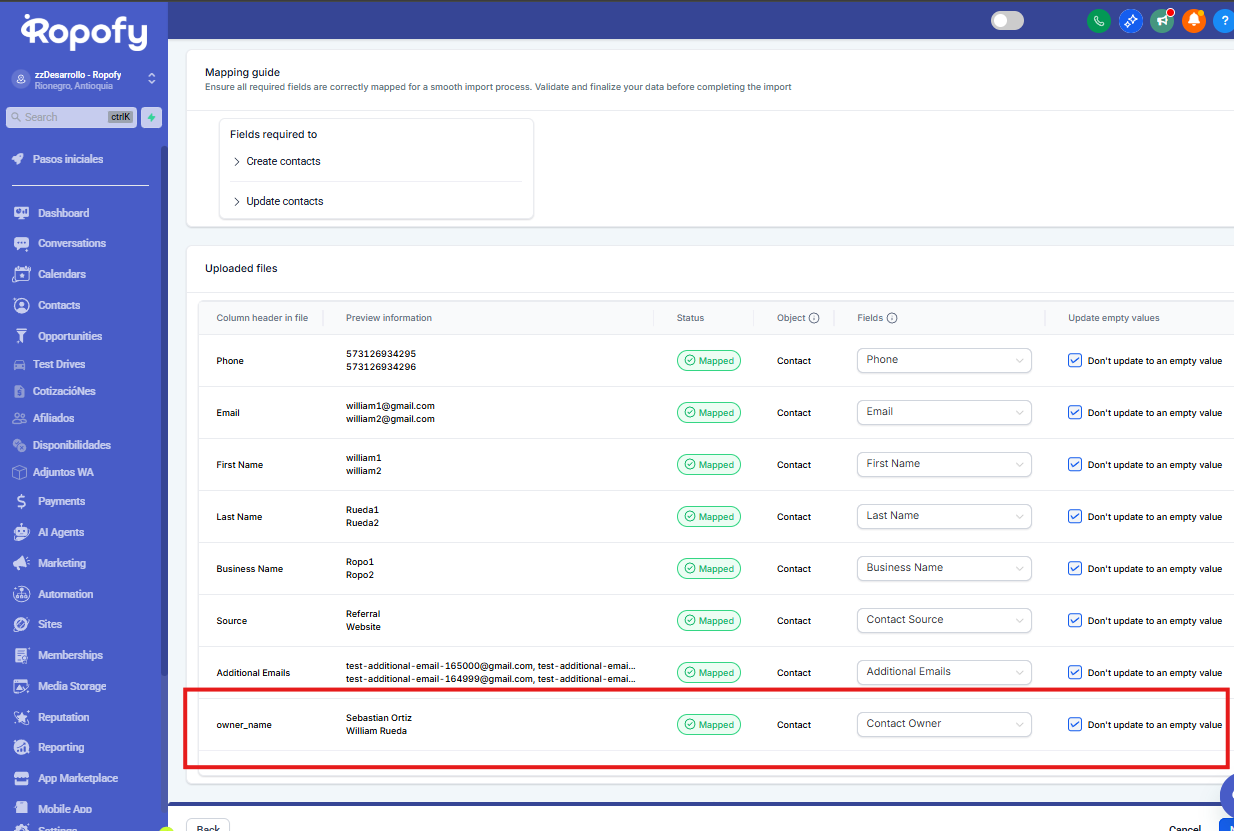 owner_namese utiliza para asignar el asesor al contacto.El valor debe ser el nombre exacto del asesor registrado en Ropofy.